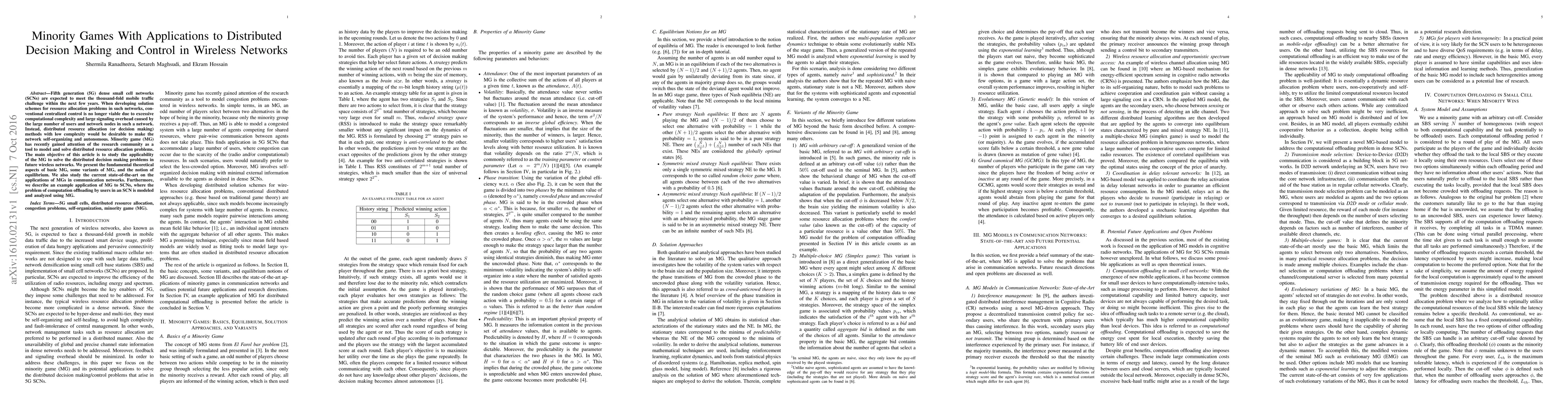 Fifth generation (5G) dense small cell networks (SCNs) are expected to meet the thousand-fold mobile traffic challenge within the next few years. When developing solution schemes for resource allocation problems in such networks, conventional centralized control is no longer viable due to excessive computational complexity and large signaling overhead caused by the large number of users and network nodes in such a network. Instead, distributed resource allocation (or decision making) methods with low complexity would be desirable to make the network self-organizing and autonomous. Minority game (MG) has recently gained attention of the research community as a tool to model and solve distributed resource allocation problems. The main objective of this article is to study the applicability of the MG to solve the distributed decision making problems in future wireless networks. We present the fundamental theoretical aspects of basic MG, some variants of MG, and the notion of equilibrium. We also study the current state-of-the-art on the applications of MGs in communication networks. Furthermore, we describe an example application of MG to SCNs, where the problem of computation offloading by users in an SCN is modeled and analyzed using MG.