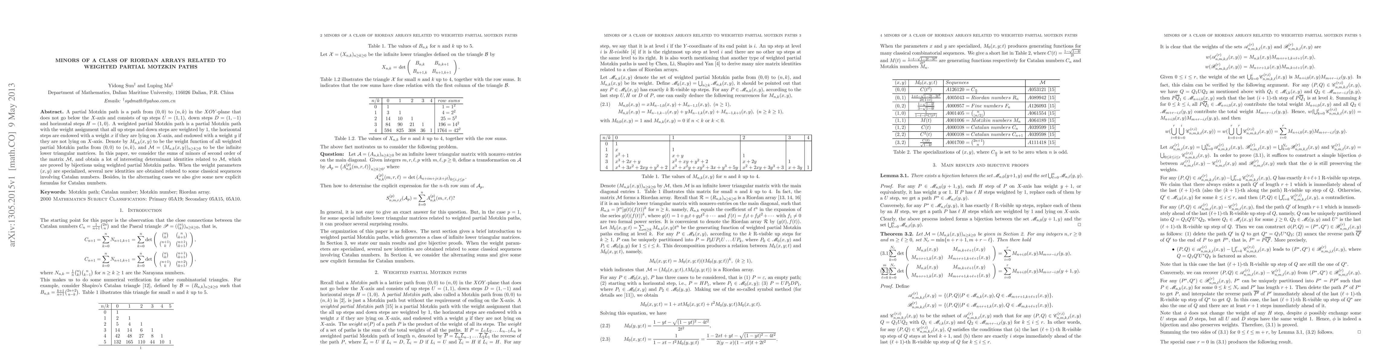 This paper investigates minors of a Riordan array associated with weighted partial Motzkin paths, deriving determinant identities via bijections. Specializing the weights yields new identities linked to classical sequences like Catalan numbers and provides explicit formulas for Catalan numbers in alternating cases.