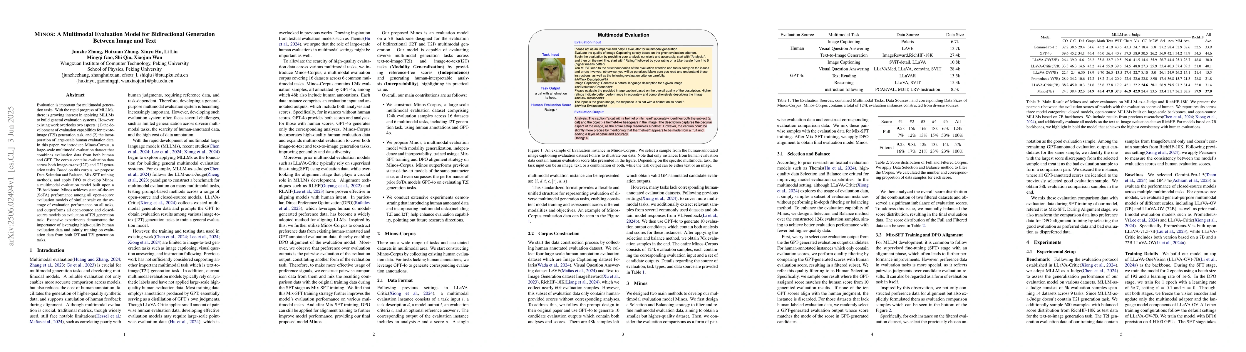 This work stands out by creating a comprehensive multimodal evaluation corpus (Minos-Corpus) that integrates human and AI evaluations, and by proposing novel training techniques (Data Selection and Balance, Mix-SFT) tailored for bidirectional image-text generation tasks.