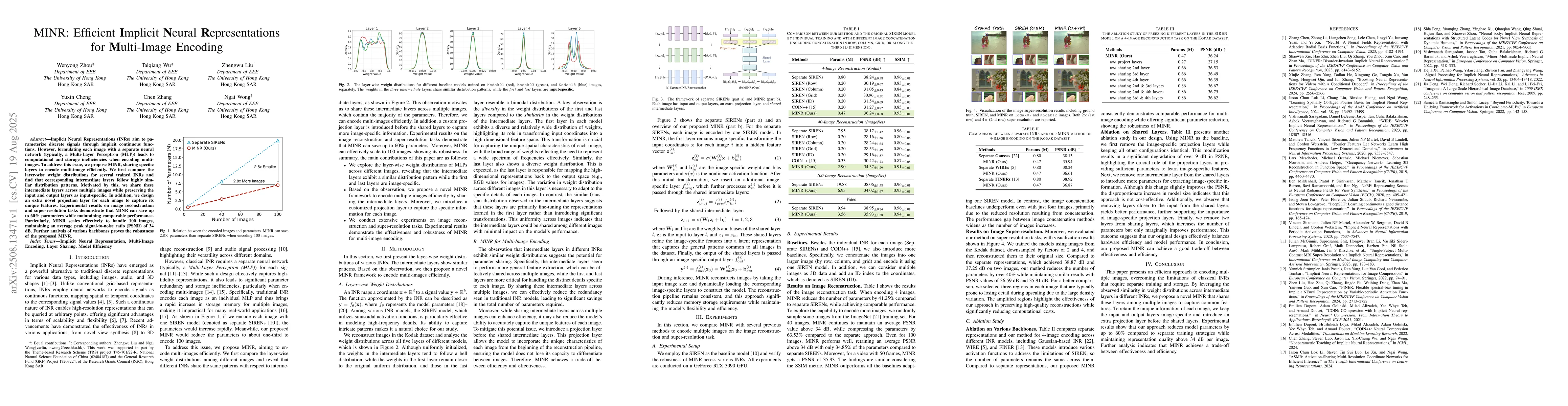 Implicit Neural Representations (INRs) aim to parameterize discrete signals through implicit continuous functions. However, formulating each image with a separate neural network~(typically, a Multi-Layer Perceptron (MLP)) leads to computational and storage inefficiencies when encoding multi-images. To address this issue, we propose MINR, sharing specific layers to encode multi-image efficiently. We first compare the layer-wise weight distributions for several trained INRs and find that corresponding intermediate layers follow highly similar distribution patterns. Motivated by this, we share these intermediate layers across multiple images while preserving the input and output layers as input-specific. In addition, we design an extra novel projection layer for each image to capture its unique features. Experimental results on image reconstruction and super-resolution tasks demonstrate that MINR can save up to 60\% parameters while maintaining comparable performance. Particularly, MINR scales effectively to handle 100 images, maintaining an average peak signal-to-noise ratio (PSNR) of 34 dB. Further analysis of various backbones proves the robustness of the proposed MINR.
