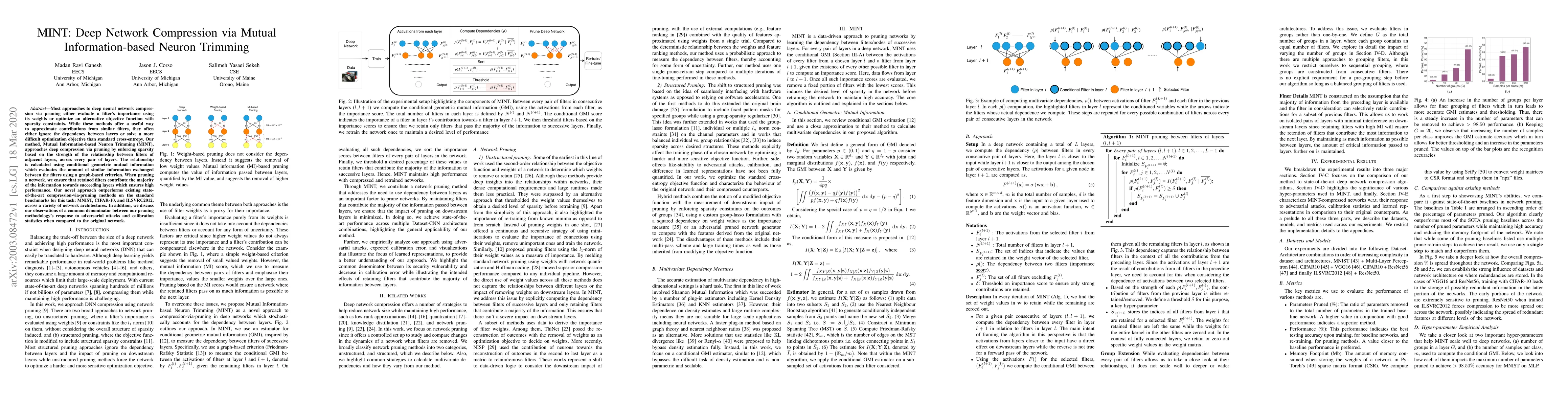 Most approaches to deep neural network compression via pruning either evaluate a filter's importance using its weights or optimize an alternative objective function with sparsity constraints. While these methods offer a useful way to approximate contributions from similar filters, they often either ignore the dependency between layers or solve a more difficult optimization objective than standard cross-entropy. Our method, Mutual Information-based Neuron Trimming (MINT), approaches deep compression via pruning by enforcing sparsity based on the strength of the relationship between filters of adjacent layers, across every pair of layers. The relationship is calculated using conditional geometric mutual information which evaluates the amount of similar information exchanged between the filters using a graph-based criterion. When pruning a network, we ensure that retained filters contribute the majority of the information towards succeeding layers which ensures high performance. Our novel approach outperforms existing state-of-the-art compression-via-pruning methods on the standard benchmarks for this task: MNIST, CIFAR-10, and ILSVRC2012, across a variety of network architectures. In addition, we discuss our observations of a common denominator between our pruning methodology's response to adversarial attacks and calibration statistics when compared to the original network.