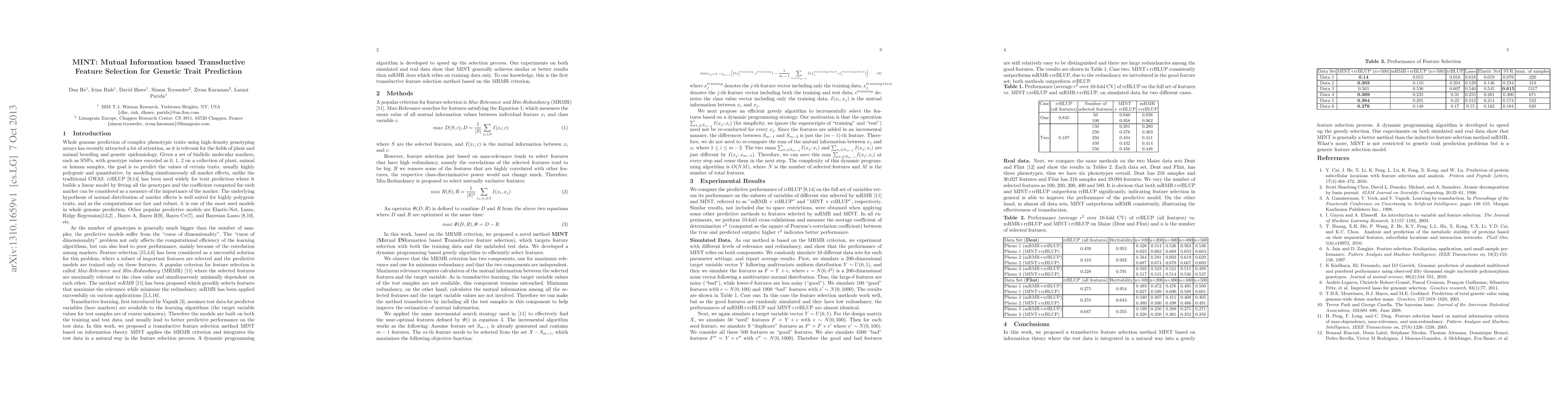 Title: MINT: Mutual Information based Transductive Feature Selection for Genetic Trait Prediction Summary: This paper introduces MINT, a transductive feature selection method based on the MRMR criterion for whole genome prediction, demonstrating improved performance over state-of-the-art inductive methods in genetic trait prediction, addressing the curse-of-dimensionality issue.