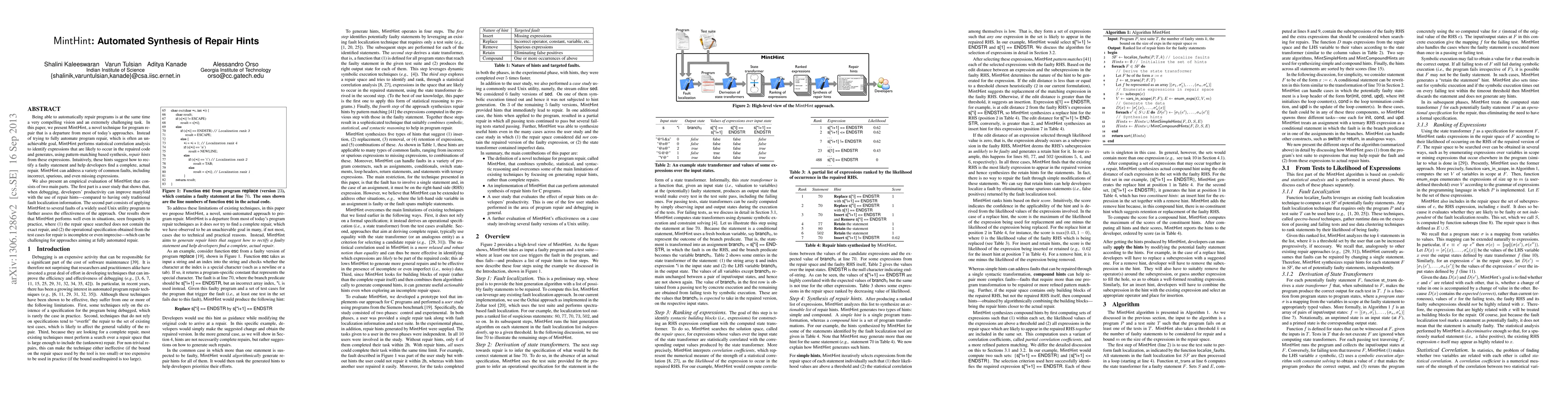 Being able to automatically repair programs is an extremely challenging task. In this paper, we present MintHint, a novel technique for program repair that is a departure from most of today's approaches. Instead of trying to fully automate program repair, which is often an unachievable goal, MintHint performs statistical correlation analysis to identify expressions that are likely to occur in the repaired code and generates, using pattern-matching based synthesis, repair hints from these expressions. Intuitively, these hints suggest how to rectify a faulty statement and help developers find a complete, actual repair. MintHint can address a variety of common faults, including incorrect, spurious, and missing expressions. We present a user study that shows that developers' productivity can improve manyfold with the use of repair hints generated by MintHint -- compared to having only traditional fault localization information. We also apply MintHint to several faults of a widely used Unix utility program to further assess the effectiveness of the approach. Our results show that MintHint performs well even in situations where (1) the repair space searched does not contain the exact repair, and (2) the operational specification obtained from the test cases for repair is incomplete or even imprecise.