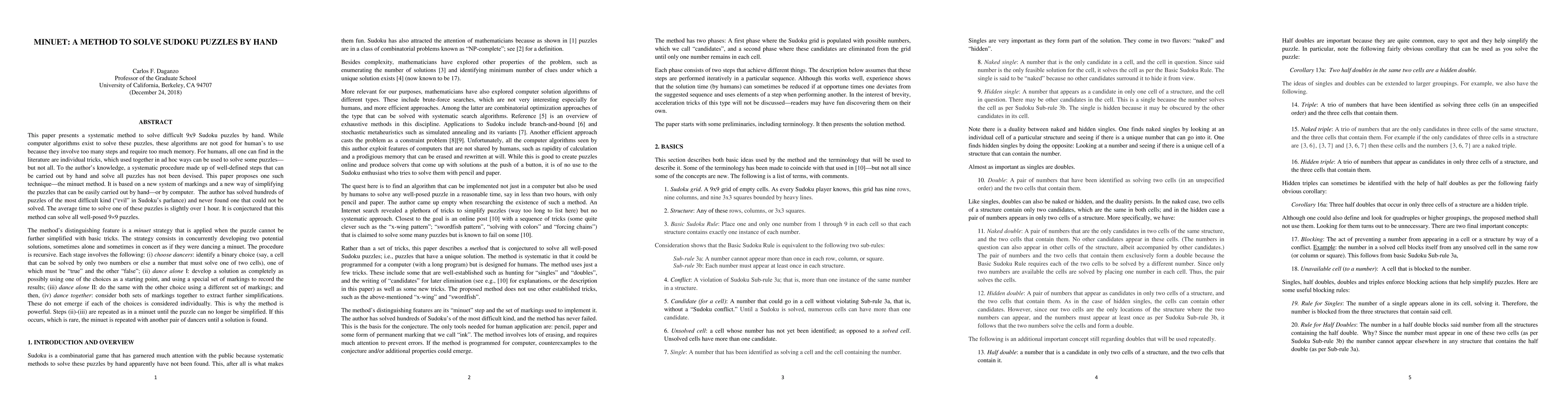 This paper introduces the 'minuet' method, a systematic technique for solving all types of 9x9 Sudoku puzzles by hand. It involves a unique marking system and simplification process, employing a 'minuet' strategy to concurrently develop two potential solutions, ensuring comprehensive puzzle resolution.