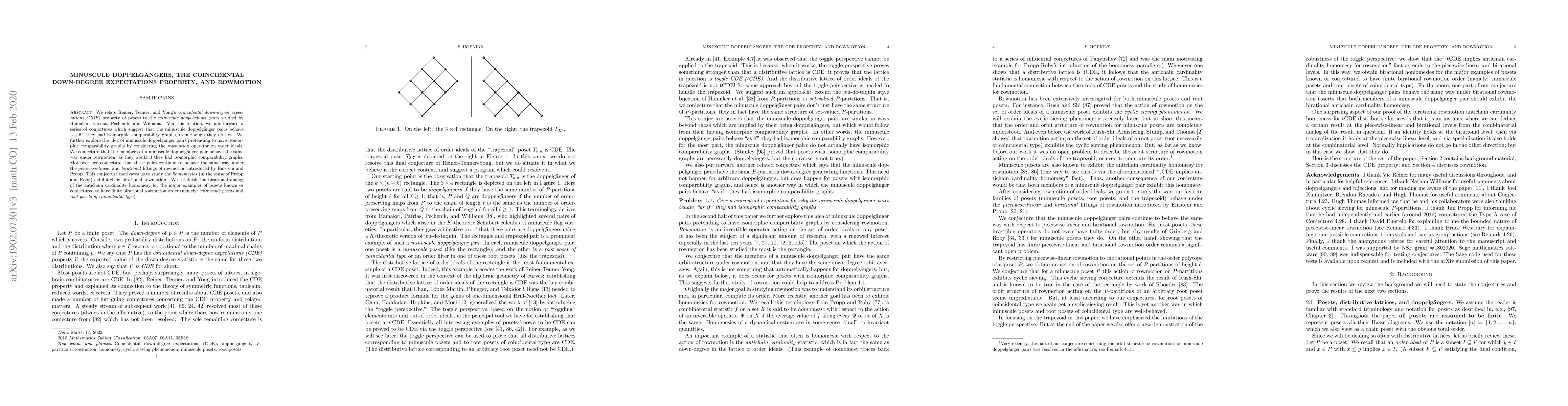 This paper explores the connection between Reiner, Tenner, and Yong's coincidental down-degree expectations (CDE) property in posets and Hamaker, Patrias, Pechenik, and Williams' study of minuscule doppelgänger pairs. It conjectures that these pairs exhibit behavior as if they had isomorphic comparability graphs, and studies this through the lens of rowmotion, suggesting similar behavior under various liftings of rowmotion.