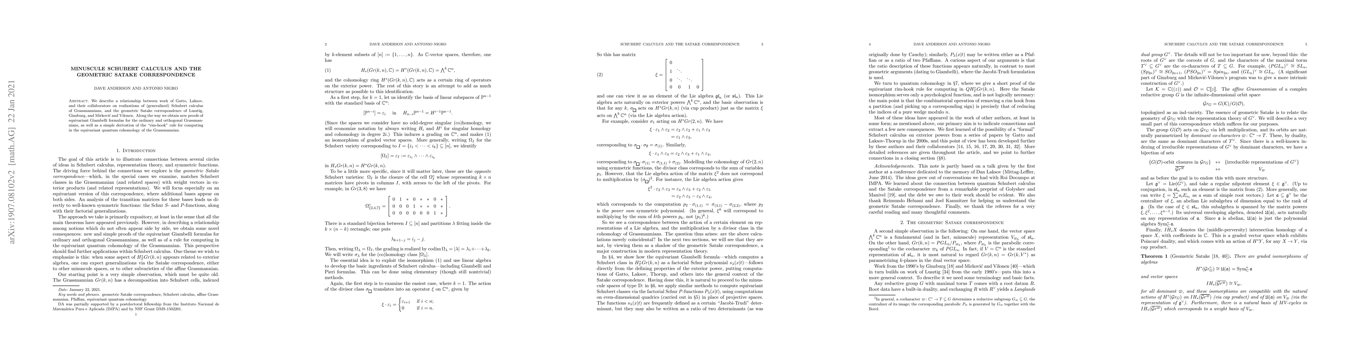 We describe a relationship between work of Laksov, Gatto, and their collaborators on realizations of (generalized) Schubert calculus of Grassmannians, and the geometric Satake correspondence of Lusztig, Ginzburg, and Mirkovi\'c and Vilonen. Along the way we obtain new proofs of equivariant Giambelli formulas for the ordinary and orthogonal Grassmannians, as well as a simple derivation of the "rim-hook" rule for computing in the equivariant quantum cohomology of the Grassmannian.