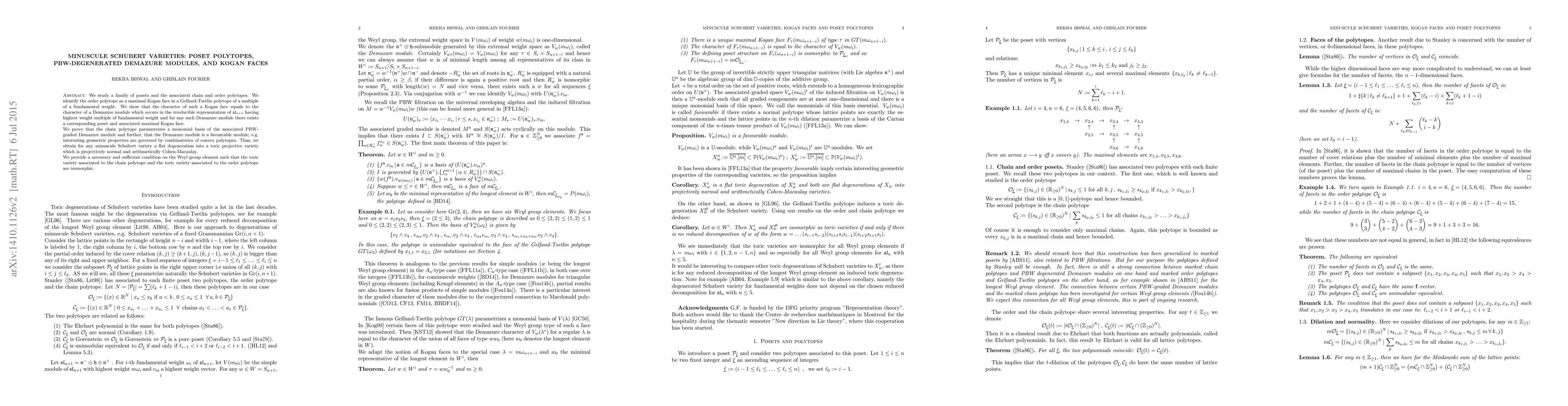 We study a family of posets and the associated chain and order polytopes. We identify the order polytope as a maximal Kogan face in a Gelfand-Tsetlin polytope of a multiple of a fundamental weight. We show that the character of such a Kogan face equals to the character of a Demazure module which occurs in the irreducible representation of $\mathfrak{sl}_n$ having highest weight multiple of fundamental weight and for any such Demazure module there exists a corresponding poset and associated maximal Kogan face. We prove that the chain polytope parametrizes a monomial basis of the associated PBW-graded Demazure module and further, that the Demazure module is a favourable module, e.g. interesting geometric properties are governed by combinatorics of convex polytopes. Thus, we obtain for any minuscule Schubert variety a flat degeneration into a toric projective variety which is projectively normal and arithmetically Cohen-Macaulay. We provide a necessary and sufficient condition on the Weyl group element such that the toric variety associated to the chain polytope and the toric variety associated to the order polytope are isomorphic.
