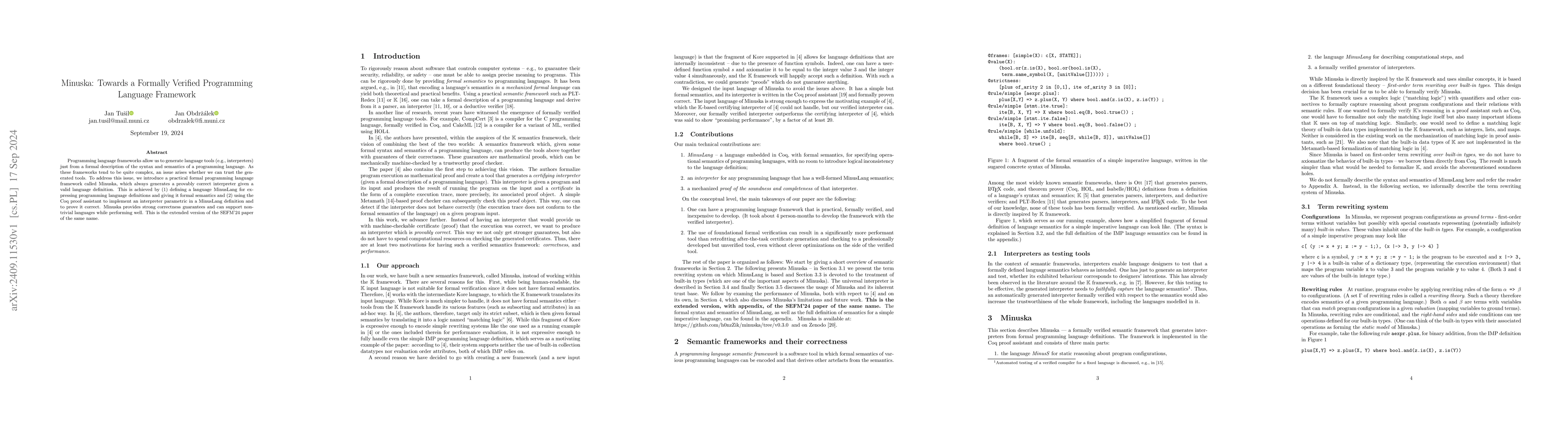 Minuska is a formally verified programming language framework that generates provably correct interpreters from formal language definitions, utilizing MinusLang and Coq for strong correctness guarantees and practical performance.