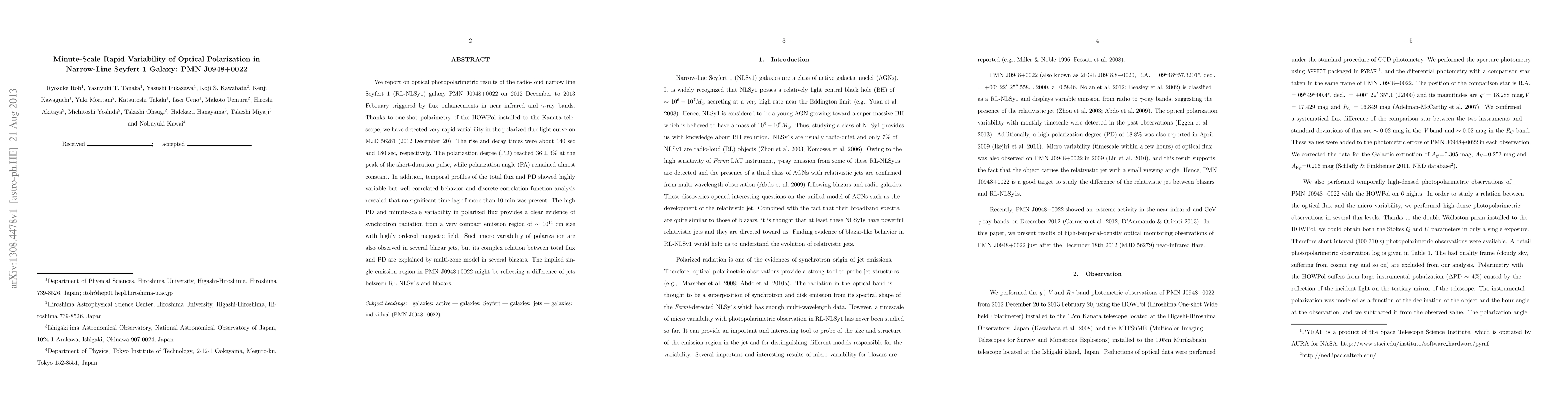 We report on optical photopolarimetric results of the radio-loud narrow line Seyfert 1 (RL-NLSy1) galaxy PMN J0948+0022 on 2012 December to 2013 February triggered by flux enhancements in near infrared and gamma-ray bands. Thanks to one-shot polarimetry of the HOWPol installed to the Kanata telescope, we have detected very rapid variability in the polarized-flux light curve on MJD 56281 (2012 December 20). The rise and decay times were about 140 sec and 180 sec, respectively. The polarization degree (PD) reached 36 +/- 3% at the peak of the short-duration pulse, while polarization angle (PA) remained almost constant. In addition, temporal profiles of the total flux and PD showed highly variable but well correlated behavior and discrete correlation function analysis revealed that no significant time lag of more than 10 min was present. The high PD and minute-scale variability in polarized flux provides a clear evidence of synchrotron radiation from a very compact emission region of 10^14 cm size with highly ordered magnetic field. Such micro variability of polarization are also observed in several blazar jets, but its complex relation between total flux and PD are explained by multi-zone model in several blazars. The implied single emission region in PMN J0948+0022 might be reflecting a difference of jets between RL-NLSy1s and blazars.