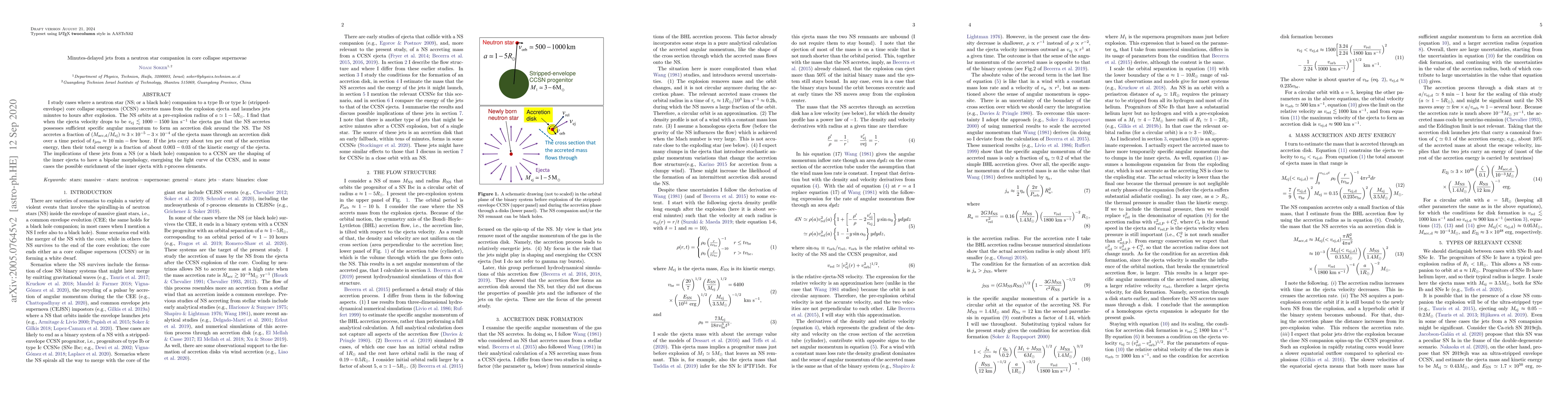 I study cases where a neutron star (NS; or a black hole) companion to a type Ib or type Ic (stripped-envelope) core collapse supernova (CCSN) accretes mass from the explosion ejecta and launches jets minutes to hours after explosion. The NS orbits at a pre-explosion radius of a=1-5Ro. I find that when the ejecta velocity drops to be <1000-1500km/s the ejecta gas that the NS accretes possesses sufficient specific angular momentum to form an accretion disk around the NS. The NS accretes a fraction of 3e-5 to 3e-4 of the ejecta mass through an accretion disk over a time period of 10min to few hours. If the jets carry about ten per cent of the accretion energy, then their total energy is a fraction of about 0.003-0.03 of the kinetic energy of the ejecta. The implications of these jets from a NS (or a black hole) companion to a CCSN are the shaping the inner ejecta to have a bipolar morphology, energising the light curve of the CCSN, and in some cases the possible enrichment of the inner ejecta with r-process elements.