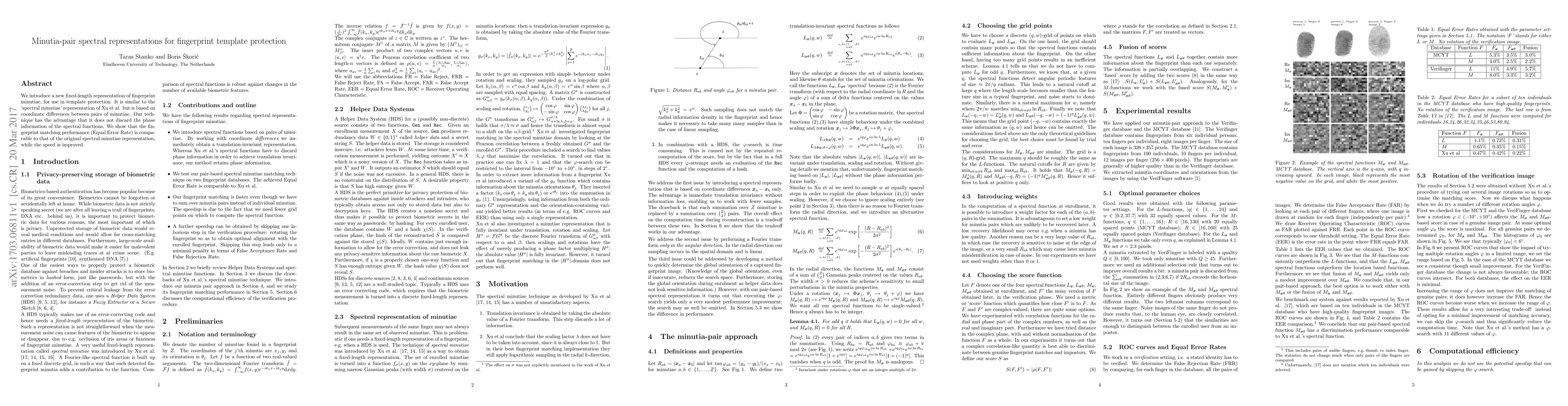 This paper proposes a new fixed-length representation of fingerprint minutiae based on coordinate differences between minutiae pairs, preserving phase information and improving matching speed while maintaining comparable Equal Error Rate performance to the original spectral minutiae representation.