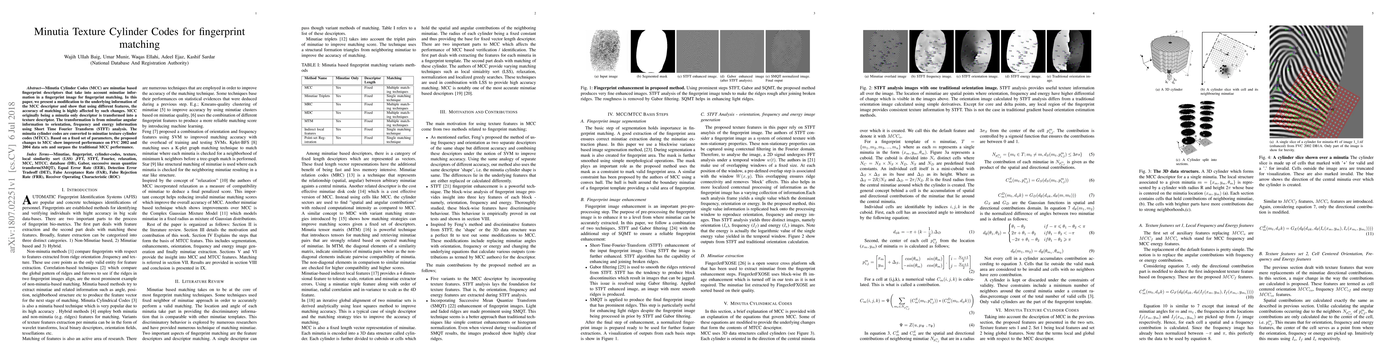 This paper modifies Minutia Cylinder Codes (MCC) to include texture information via Short Time Fourier Transform (STFT), creating Minutiae Texture Cylinder Codes (MTCC). The transformed descriptor shows enhanced matching accuracy on FVC 2002 and 2004 datasets compared to traditional MCC.