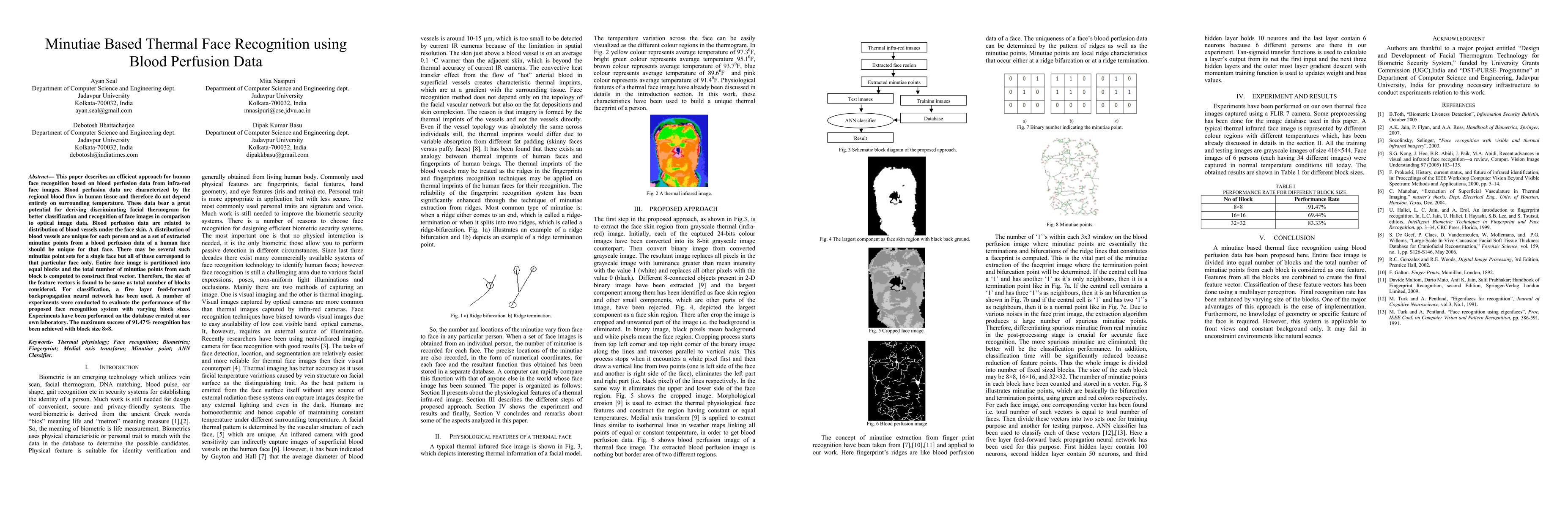 This paper proposes a face recognition method using blood perfusion data from infrared images, extracting unique minutiae points from blood vessel distributions for individual identification. A five-layer neural network achieved a maximum recognition rate of 91.47% using an 8x8 block size.