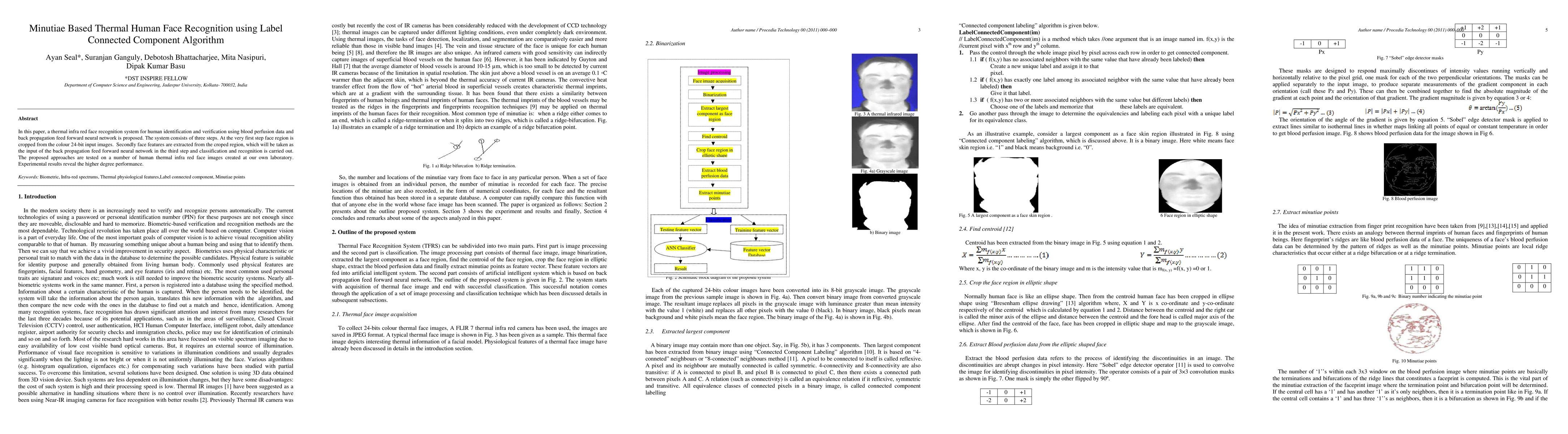 This paper proposes a thermal infrared face recognition system using blood perfusion data and a back propagation feed forward neural network. The system extracts minutiae features from cropped face regions and achieves high performance in human identification and verification.