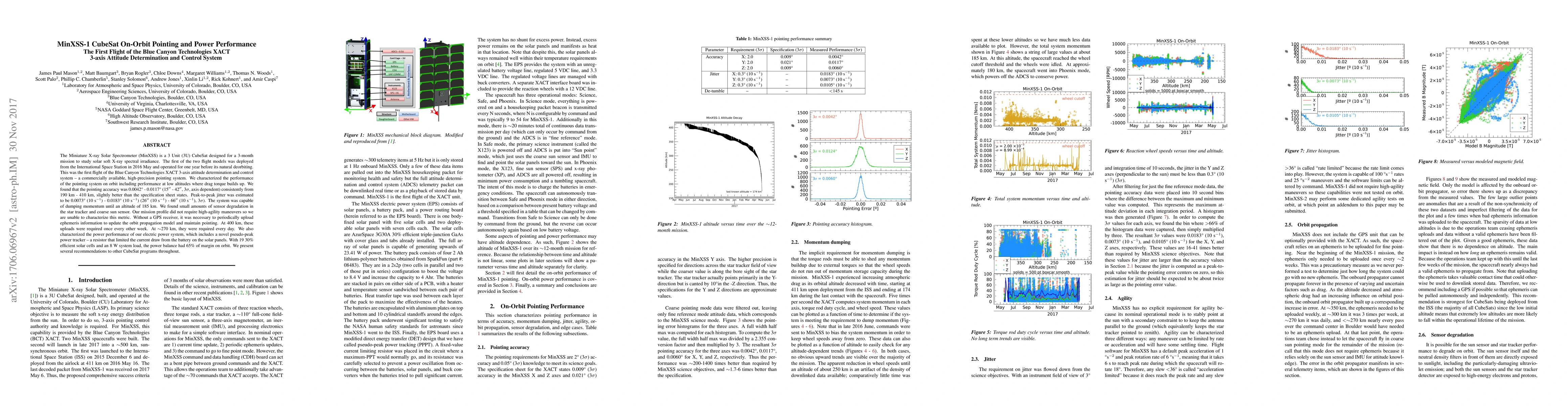 The MinXSS-1 CubeSat successfully deployed the Blue Canyon Technologies XACT 3-axis attitude determination and control system, achieving 0.0042° - 0.0117° pointing accuracy and 65% power margin, slightly exceeding specifications. Sensor degradation was minimal, and periodic orbit updates were necessary for precise pointing.
