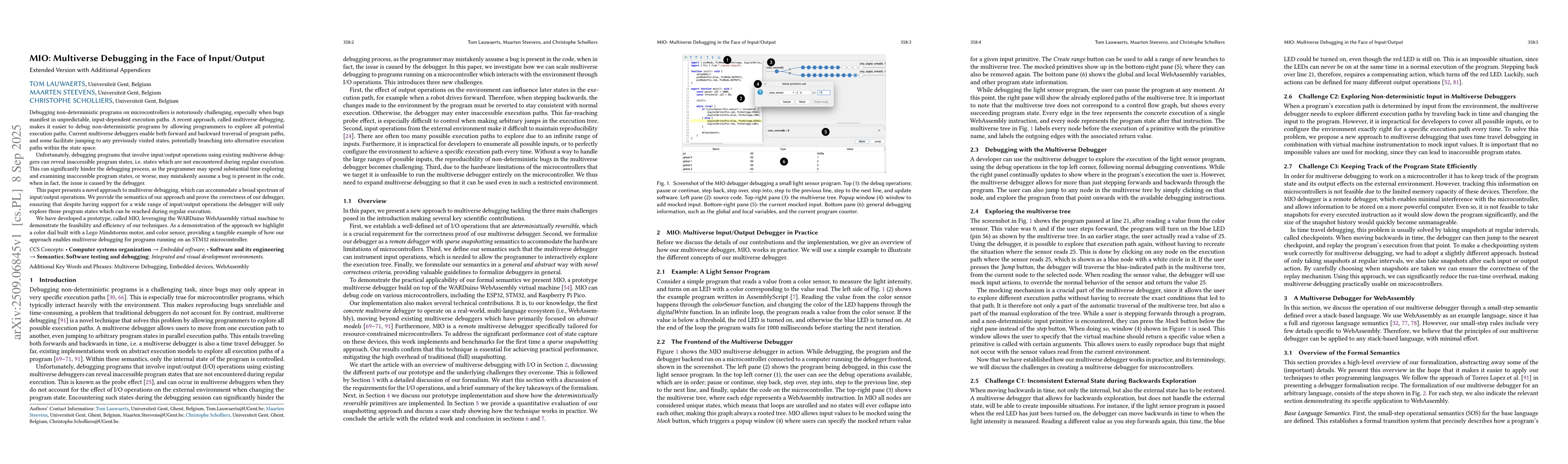 Debugging non-deterministic programs on microcontrollers is notoriously challenging, especially when bugs manifest in unpredictable, input-dependent execution paths. A recent approach, called multiverse debugging, makes it easier to debug non-deterministic programs by allowing programmers to explore all potential execution paths. Current multiverse debuggers enable both forward and backward traversal of program paths, and some facilitate jumping to any previously visited states, potentially branching into alternative execution paths within the state space. Unfortunately, debugging programs that involve input/output operations using existing multiverse debuggers can reveal inaccessible program states, i.e. states which are not encountered during regular execution. This can significantly hinder the debugging process, as the programmer may spend substantial time exploring and examining inaccessible program states, or worse, may mistakenly assume a bug is present in the code, when in fact, the issue is caused by the debugger. This paper presents a novel approach to multiverse debugging, which can accommodate a broad spectrum of input/output operations. We provide the semantics of our approach and prove the correctness of our debugger, ensuring that despite having support for a wide range of input/output operations the debugger will only explore those program states which can be reached during regular execution. We have developed a prototype, called MIO, leveraging the WARDuino WebAssembly virtual machine to demonstrate the feasibility and efficiency of our techniques. As a demonstration of the approach we highlight a color dial built with a Lego Mindstorms motor, and color sensor, providing a tangible example of how our approach enables multiverse debugging for programs running on an STM32 microcontroller.