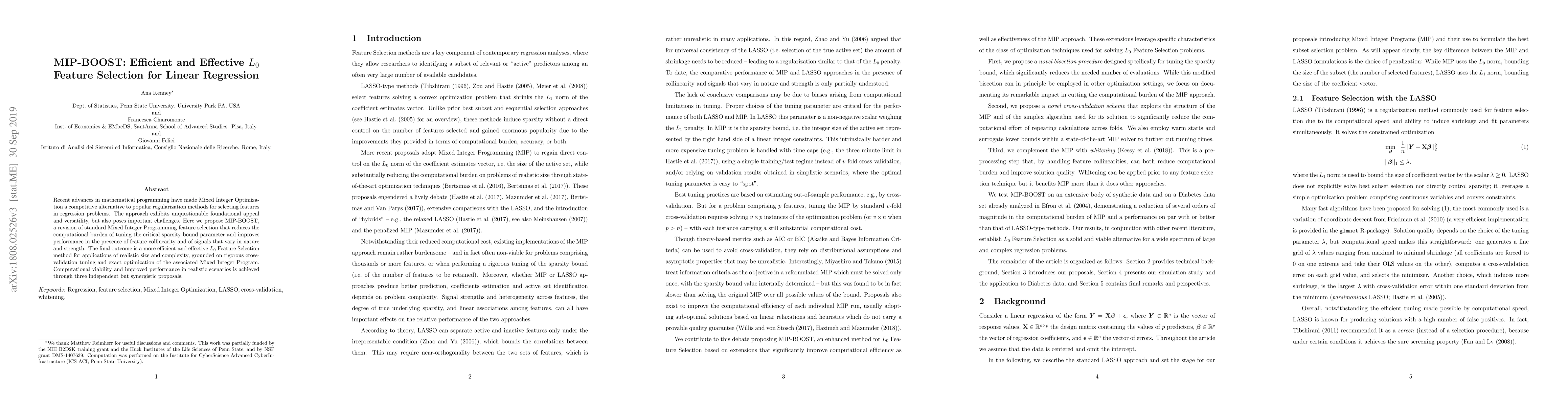The research introduces MIP-BOOST, a revised Mixed Integer Programming feature selection method for linear regression, addressing computational challenges and improving performance with feature collinearity and diverse signal strengths. It achieves this through three synergistic proposals, ensuring efficiency and effectiveness in realistic, complex scenarios via rigorous cross-validation tuning and exact optimization.