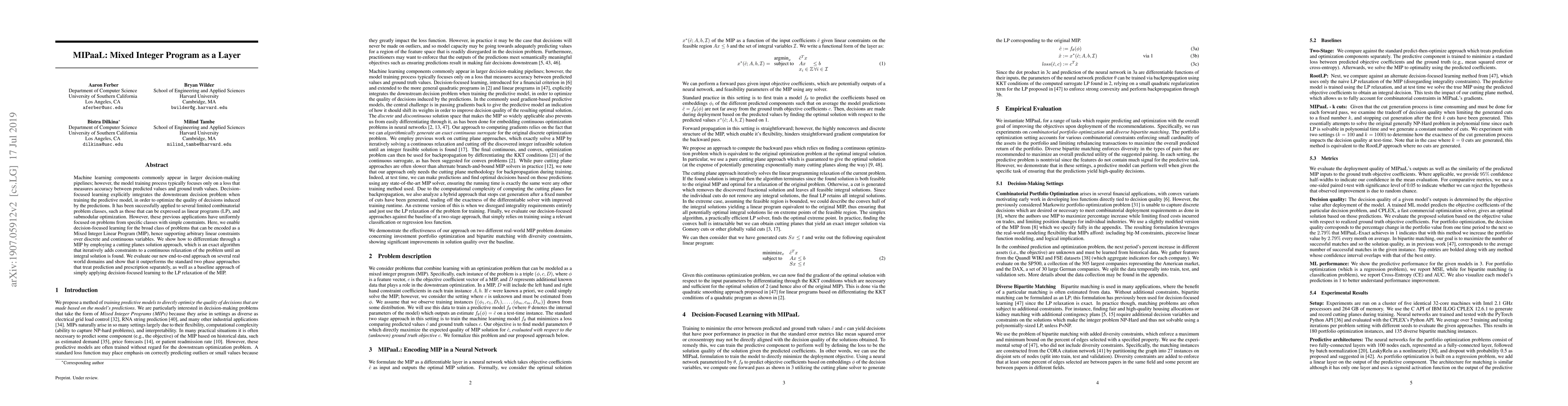 Machine learning components commonly appear in larger decision-making pipelines; however, the model training process typically focuses only on a loss that measures accuracy between predicted values and ground truth values. Decision-focused learning explicitly integrates the downstream decision problem when training the predictive model, in order to optimize the quality of decisions induced by the predictions. It has been successfully applied to several limited combinatorial problem classes, such as those that can be expressed as linear programs (LP), and submodular optimization. However, these previous applications have uniformly focused on problems from specific classes with simple constraints. Here, we enable decision-focused learning for the broad class of problems that can be encoded as a Mixed Integer Linear Program (MIP), hence supporting arbitrary linear constraints over discrete and continuous variables. We show how to differentiate through a MIP by employing a cutting planes solution approach, which is an exact algorithm that iteratively adds constraints to a continuous relaxation of the problem until an integral solution is found. We evaluate our new end-to-end approach on several real world domains and show that it outperforms the standard two phase approaches that treat prediction and prescription separately, as well as a baseline approach of simply applying decision-focused learning to the LP relaxation of the MIP.