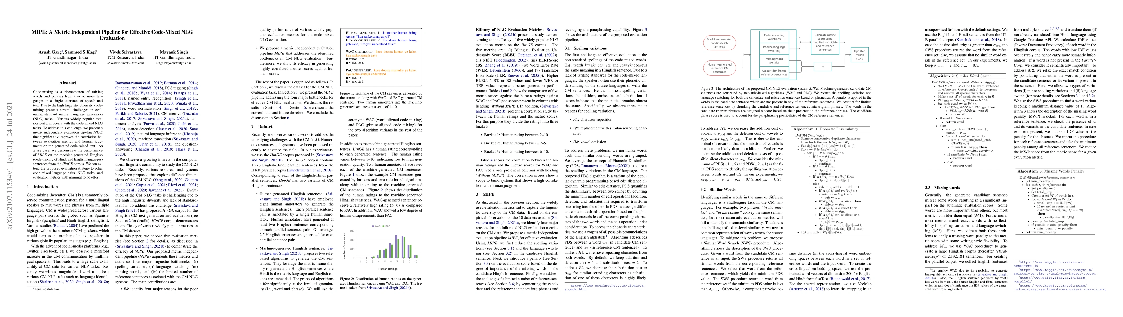 The paper introduces MIPE, a Metric Independent Pipeline for Evaluating Code-Mixed Natural Language Generation (NLG), which enhances the correlation between evaluation metrics and human judgments for code-mixed text. Demonstrated on Hinglish sentences, MIPE's approach can be extended to other code-mixed language pairs and NLG tasks.