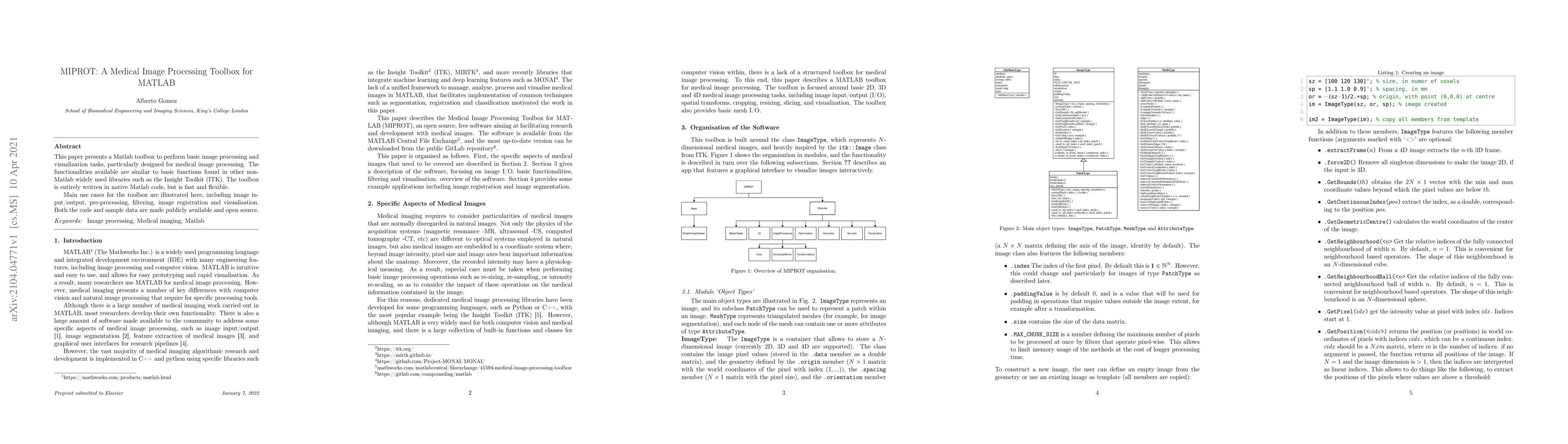 This paper introduces MIPROT, a Matlab toolbox for medical image processing, offering functionalities similar to the Insight Toolkit. It includes image input/output, pre-processing, filtering, registration, and visualization, and is open source with publicly available code and sample data.