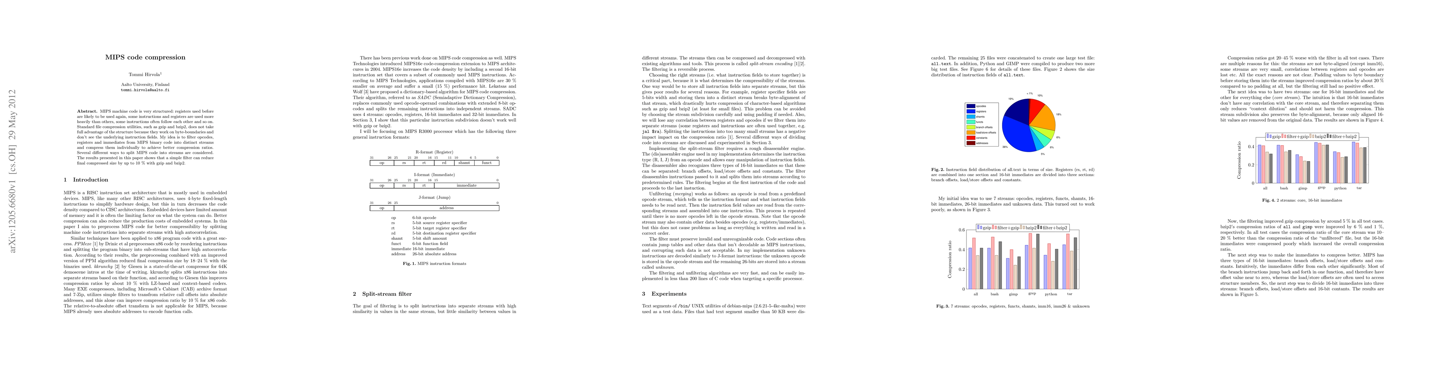 Research on MIPS machine code compression reveals that filtering opcodes, registers, and immediates into distinct streams can achieve better compression ratios, with a simple filter reducing final compressed size by up to 10%.