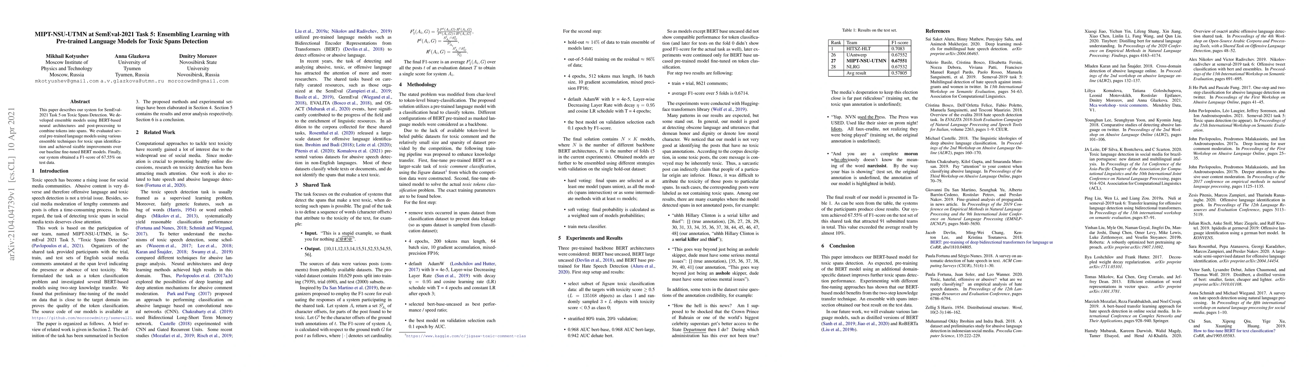 This paper presents an ensemble model combining BERT-based neural architectures for toxic span detection in SemEval-2021 Task 5, achieving a F1-score of 67.55% and demonstrating significant improvement over baseline BERT models.