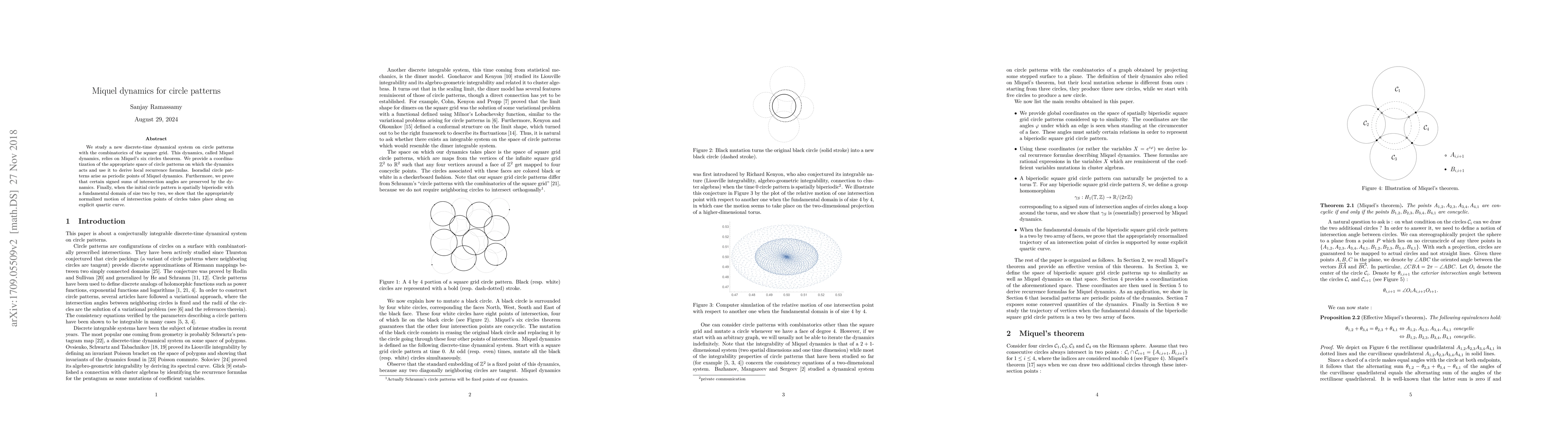 Miquel dynamics is a new discrete-time system on circle patterns based on Miquel's six circles theorem, revealing periodic isoradial patterns and preserving certain signed sums of intersection angles. For biperiodic patterns, the normalized motion of intersection points follows a specific quartic curve.