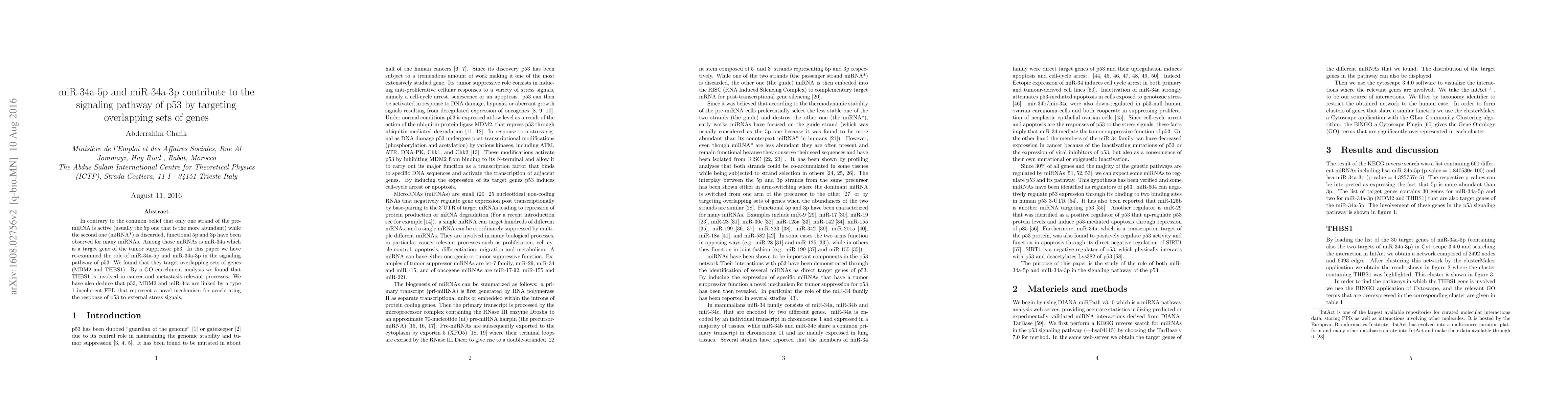In contrary to the common belief that only one strand of the pre-miRNA is active (usually the 5p one that is the more abundant) while the second one (miRNA*) is discarded, functional 5p and 3p have been observed for many miRNAs. Among those miRNAs is miR-34a which is a target gene of the tumor suppressor p53. In this paper we have re-examined the role of miR-34a-5p and miR-34a-3p in the signaling pathway of p53. We found that they target overlapping sets of genes (MDM2 and THBS1). By a GO enrichment analysis we found that THBS1 is involved in cancer and metastasis relevant processes. We have also deduce that p53, MDM2 and miR-34a are linked by a type 1 incoherent FFL that represent a novel mechanism for accelerating the response of p53 to external stress signals.