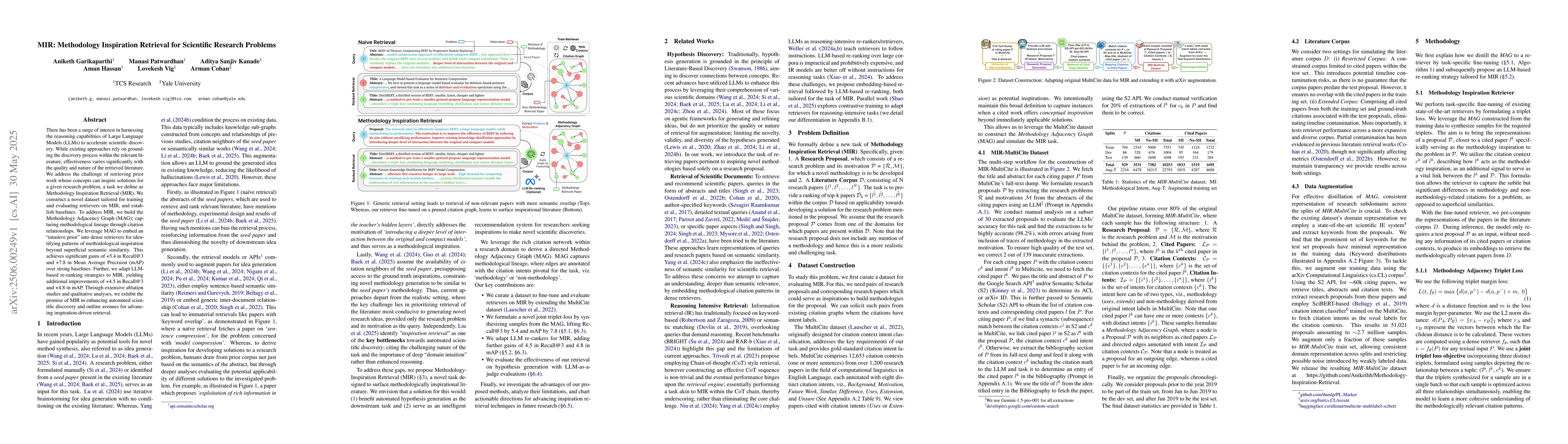 The research introduces Methodology Inspiration Retrieval (MIR) for scientific discovery, utilizing Large Language Models (LLMs) and constructing a Methodology Adjacency Graph (MAG) to capture methodological lineage through citation relationships. It establishes baselines and demonstrates significant gains with MAG-guided sampling and LLM-based re-ranking strategies.