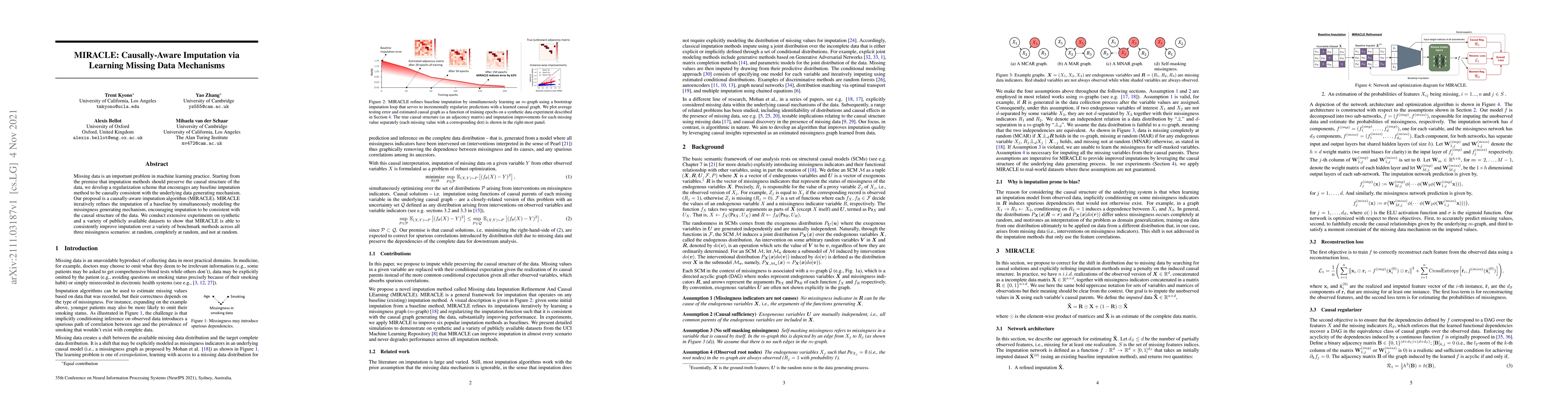 Missing data is an important problem in machine learning practice. Starting from the premise that imputation methods should preserve the causal structure of the data, we develop a regularization scheme that encourages any baseline imputation method to be causally consistent with the underlying data generating mechanism. Our proposal is a causally-aware imputation algorithm (MIRACLE). MIRACLE iteratively refines the imputation of a baseline by simultaneously modeling the missingness generating mechanism, encouraging imputation to be consistent with the causal structure of the data. We conduct extensive experiments on synthetic and a variety of publicly available datasets to show that MIRACLE is able to consistently improve imputation over a variety of benchmark methods across all three missingness scenarios: at random, completely at random, and not at random.