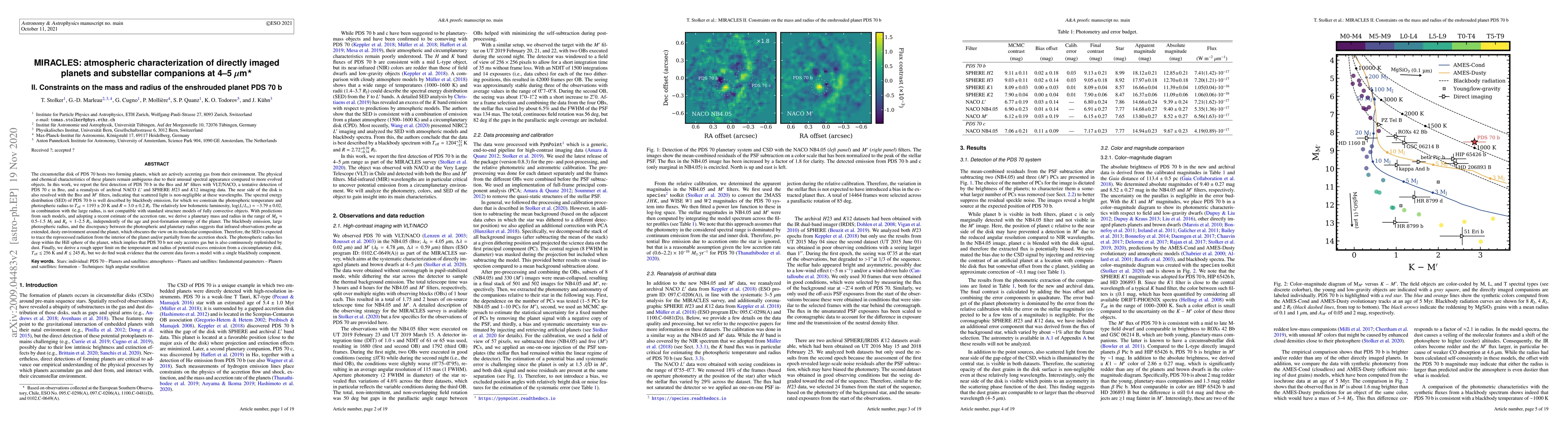 The circumstellar disk of PDS 70 hosts two forming planets, which are actively accreting gas from their environment. In this work, we report the first detection of PDS 70 b in the Br$\alpha$ and $M'$ filters with VLT/NACO, a tentative detection of PDS 70 c in Br$\alpha$, and a reanalysis of archival NACO $L'$ and SPHERE $H23$ and $K12$ imaging data. The near side of the disk is also resolved with the Br$\alpha$ and $M'$ filters, indicating that scattered light is non-negligible at these wavelengths. The spectral energy distribution of PDS 70 b is well described by blackbody emission, for which we constrain the photospheric temperature and photospheric radius to $T_\mathrm{eff}=1193 \pm 20$ K and $R=3.0 \pm 0.2$ $R_\mathrm{J}$. The relatively low bolometric luminosity, $\log(L/L_\odot) = -3.79 \pm 0.02$, in combination with the large radius, is not compatible with standard structure models of fully convective objects. With predictions from such models, and adopting a recent estimate of the accretion rate, we derive a planetary mass and radius in the range of $M_\mathrm{p}\approx 0.5-1.5$ $M_\mathrm{J}$ and $R_\mathrm{p}\approx 1-2.5$ $R_\mathrm{J}$, independently of the age and post-formation entropy of the planet. The blackbody emission, large photospheric radius, and the discrepancy between the photospheric and planetary radius suggests that infrared observations probe an extended, dusty environment around the planet, which obscures the view on its molecular composition. Finally, we derive a rough upper limit on the temperature and radius of potential excess emission from a circumplanetary disk, $T_\mathrm{eff}\lesssim256$ K and $R\lesssim245$ $R_\mathrm{J}$, but we do find weak evidence that the current data favors a model with a single blackbody component.