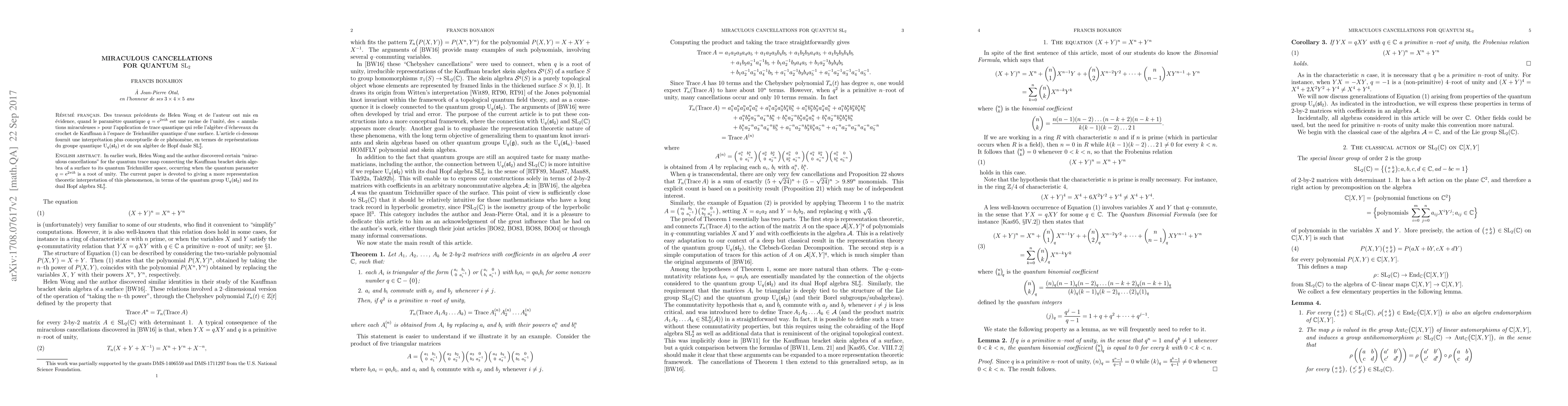 This paper explores "miraculous cancellations" in the quantum trace map linking surface skein algebras to quantum Teichmueller spaces when the quantum parameter $q$ is a root of unity, providing a representation-theoretic interpretation via the quantum group $U_q(sl_2)$ and its dual Hopf algebra $SL_2^q$.
