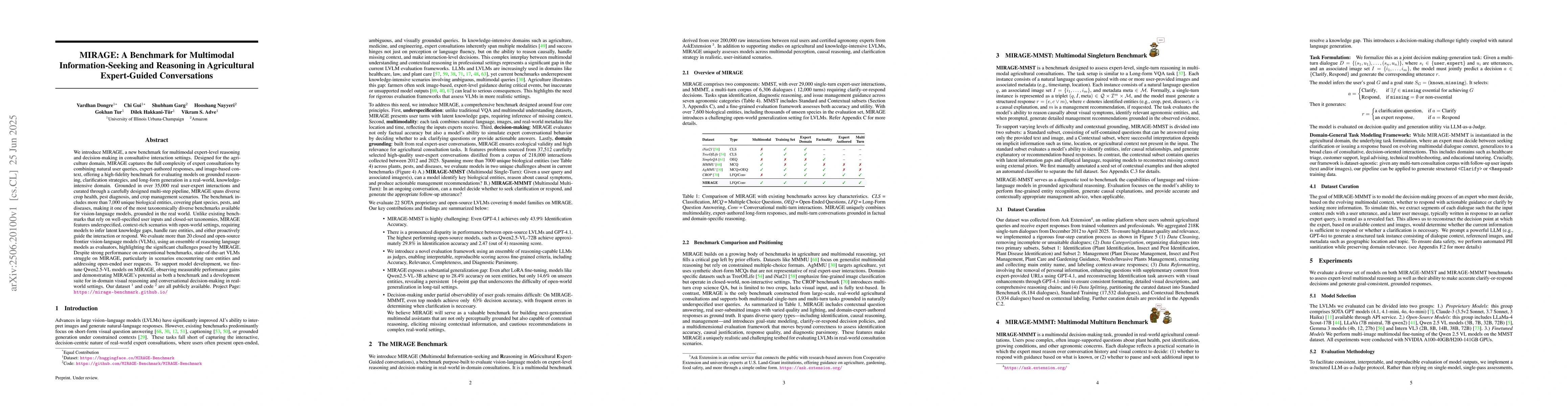 MIRAGE is a new benchmark for evaluating multimodal models in agricultural consultations, combining user queries, expert responses, and images. It's based on 35,000 real interactions and includes 7,000 unique biological entities, focusing on open-world settings and knowledge-intensive scenarios.