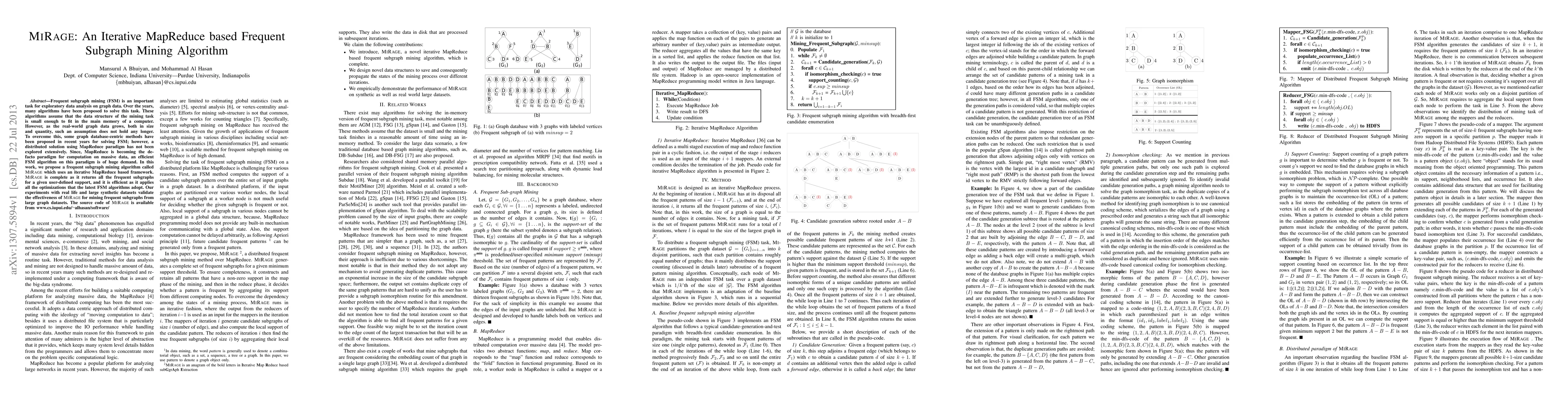 MIRAGE is an iterative MapReduce-based algorithm for frequent subgraph mining that efficiently handles large graph datasets by leveraging distributed computing. It incorporates optimizations from the latest FSM algorithms and is validated through experiments on both real and synthetic datasets.