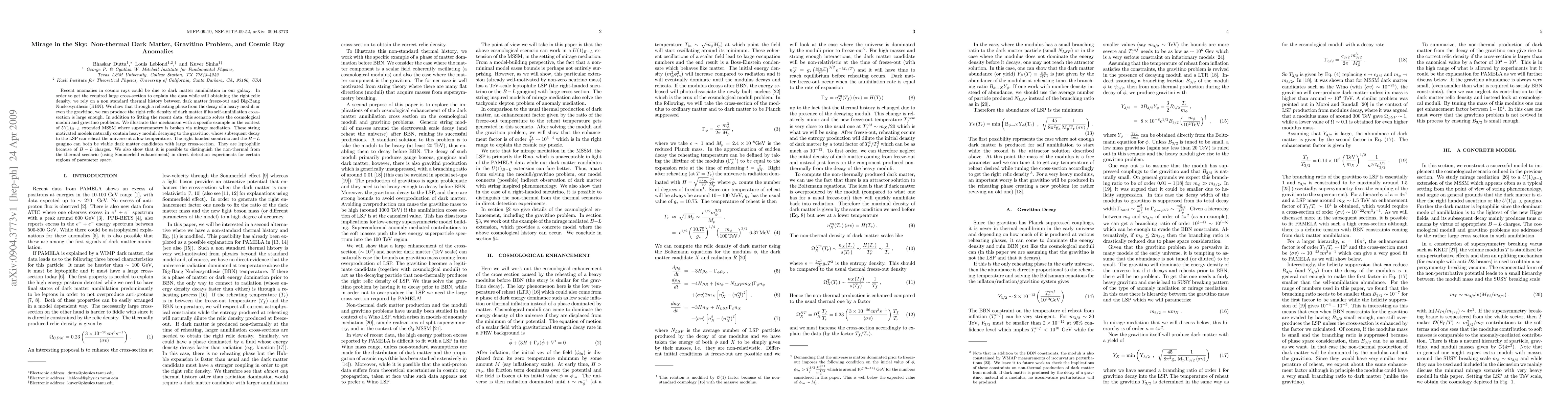Recent anomalies in cosmic rays could be due to dark matter annihilation in our galaxy. In order to get the required large cross-section to explain the data while still obtaining the right relic density, we rely on a non standard thermal history between dark matter freeze-out and Big-Bang Nucleosynthesis (BBN). We show that through a reheating phase from the decay of a heavy moduli or even the gravitino, we can produce the right relic density of dark matter if its self-annihilation cross-section is large enough. In addition to fitting the recent data, this scenario solves the cosmological moduli and gravitino problems. We illustrate this mechanism with a specific example in the context of U(1)_{B-L} extended MSSM where supersymmetry is broken via mirage mediation. These string motivated models naturally contain heavy moduli decaying to the gravitino, whose subsequent decay to the LSP can reheat the universe at a low temperature. The right-handed sneutrino and the B-L gaugino can both be viable dark matter candidates with large cross-section. They are leptophilic because of B-L charges. We also show that it is possible to distinguish the non-thermal from the thermal scenario (using Sommerfeld enhancement) in direct detection experiments for certain regions of parameter space.