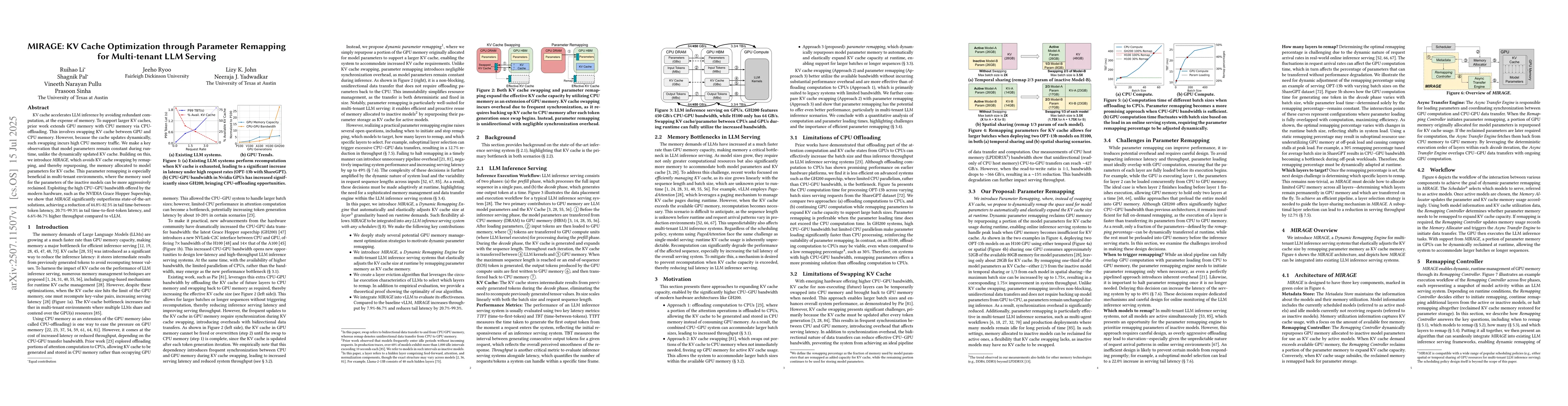 KV cache accelerates LLM inference by avoiding redundant computation, at the expense of memory. To support larger KV caches, prior work extends GPU memory with CPU memory via CPU-offloading. This involves swapping KV cache between GPU and CPU memory. However, because the cache updates dynamically, such swapping incurs high CPU memory traffic. We make a key observation that model parameters remain constant during runtime, unlike the dynamically updated KV cache. Building on this, we introduce MIRAGE, which avoids KV cache swapping by remapping, and thereby repurposing, the memory allocated to model parameters for KV cache. This parameter remapping is especially beneficial in multi-tenant environments, where the memory used for the parameters of the inactive models can be more aggressively reclaimed. Exploiting the high CPU-GPU bandwidth offered by the modern hardware, such as the NVIDIA Grace Hopper Superchip, we show that MIRAGE significantly outperforms state-of-the-art solutions, achieving a reduction of 44.8%-82.5% in tail time-between-token latency, 20.7%-99.3% in tail time-to-first-token latency, and 6.6%-86.7% higher throughput compared to vLLM.