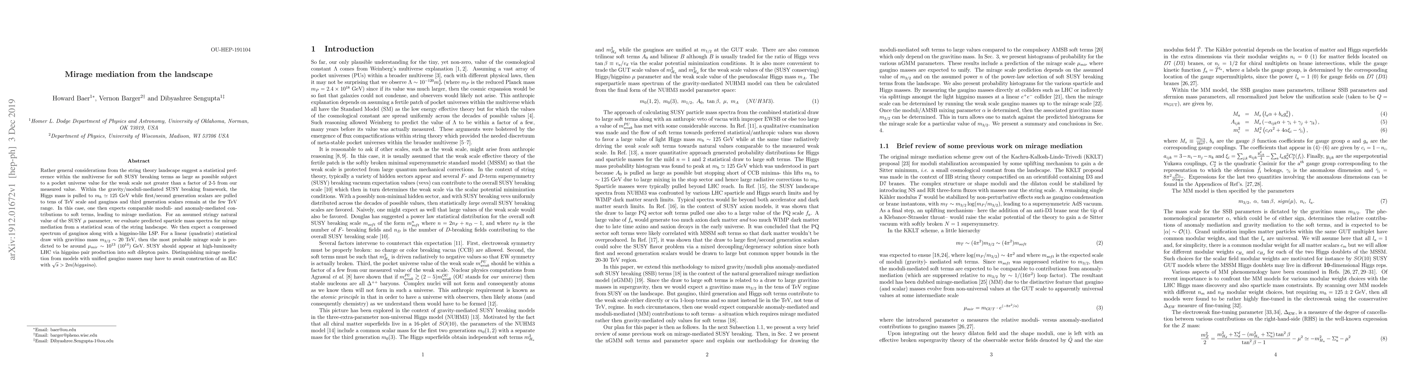 This paper explores mirage mediation in the context of the string theory landscape, predicting a compressed spectrum of gauginos and a higgsino-like lightest supersymmetric particle (LSP). It suggests that SUSY can be detected at the high-luminosity LHC through higgsino pair production, with distinguishing mirage mediation from unified gaugino models requiring an ILC with higher energy.