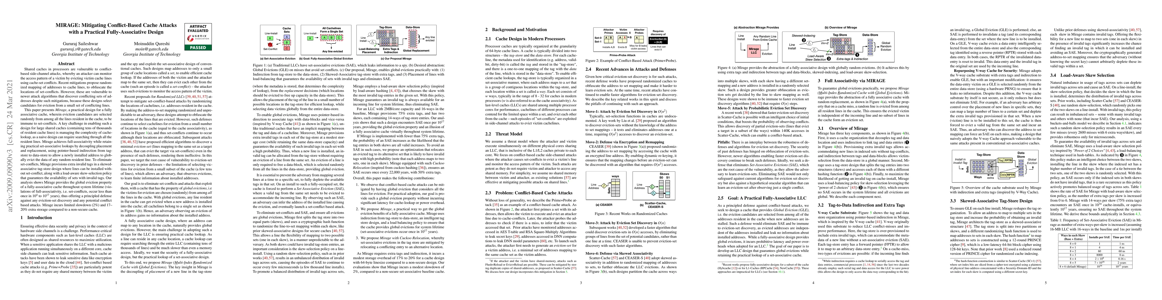 Mirage presents a practical fully-associative cache design to mitigate conflict-based cache attacks by randomly selecting eviction candidates from all cache lines, thus eliminating set-conflicts. It achieves this through a decoupled placement and replacement mechanism, extra invalid tags, and a skewed-associative tag-store, while maintaining manageable lookup complexity and minimal performance overhead.
