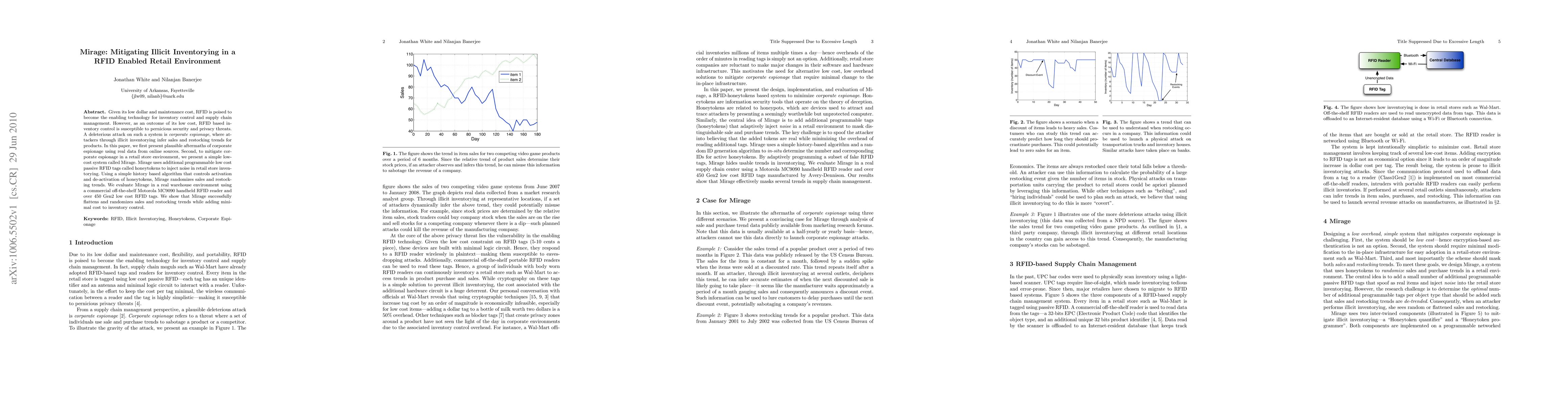 This paper discusses the security threats posed by RFID-based inventory control, particularly corporate espionage through illicit inventorying. It proposes Mirage, a low-cost system using programmable RFID honeytokens to randomize sales and restocking trends, thereby mitigating espionage risks while maintaining minimal additional costs.