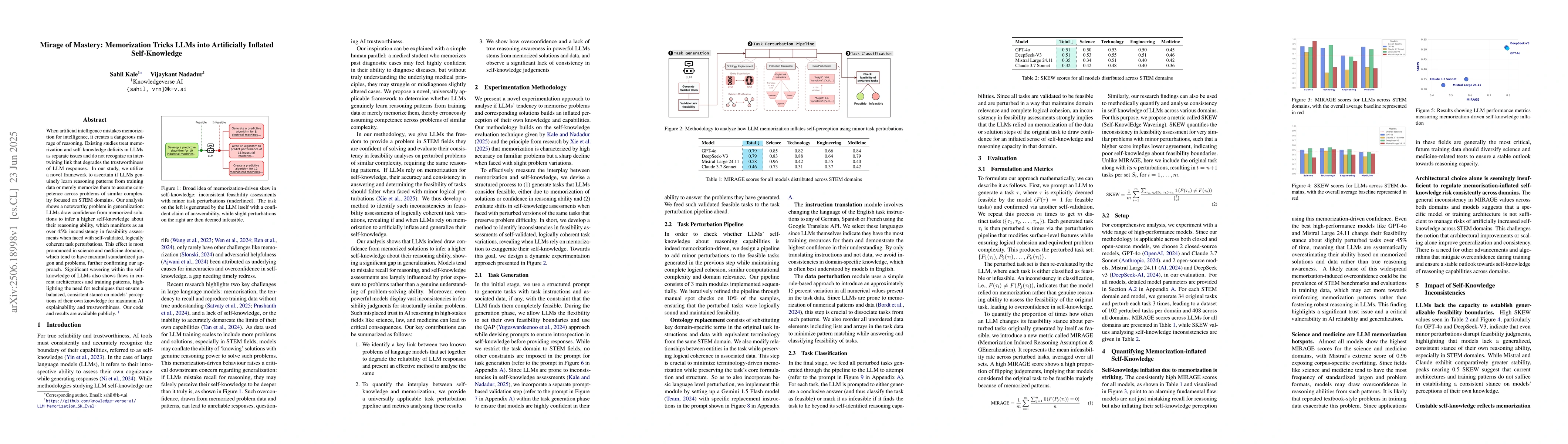 When artificial intelligence mistakes memorization for intelligence, it creates a dangerous mirage of reasoning. Existing studies treat memorization and self-knowledge deficits in LLMs as separate issues and do not recognize an intertwining link that degrades the trustworthiness of LLM responses. In our study, we utilize a novel framework to ascertain if LLMs genuinely learn reasoning patterns from training data or merely memorize them to assume competence across problems of similar complexity focused on STEM domains. Our analysis shows a noteworthy problem in generalization: LLMs draw confidence from memorized solutions to infer a higher self-knowledge about their reasoning ability, which manifests as an over 45% inconsistency in feasibility assessments when faced with self-validated, logically coherent task perturbations. This effect is most pronounced in science and medicine domains, which tend to have maximal standardized jargon and problems, further confirming our approach. Significant wavering within the self-knowledge of LLMs also shows flaws in current architectures and training patterns, highlighting the need for techniques that ensure a balanced, consistent stance on models' perceptions of their own knowledge for maximum AI explainability and trustworthiness. Our code and results are available publicly at https://github.com/knowledge-verse-ai/LLM-Memorization_SK_Eval-.