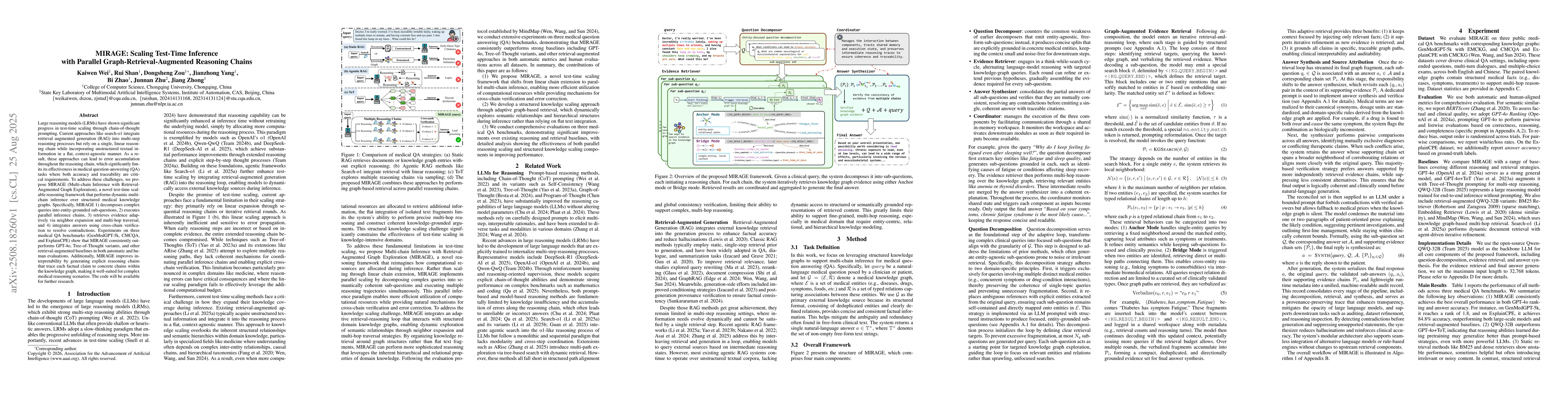 Large reasoning models (LRMs) have shown significant progress in test-time scaling through chain-of-thought prompting. Current approaches like search-o1 integrate retrieval augmented generation (RAG) into multi-step reasoning processes but rely on a single, linear reasoning chain while incorporating unstructured textual information in a flat, context-agnostic manner. As a result, these approaches can lead to error accumulation throughout the reasoning chain, which significantly limits its effectiveness in medical question-answering (QA) tasks where both accuracy and traceability are critical requirements. To address these challenges, we propose MIRAGE (Multi-chain Inference with Retrieval-Augmented Graph Exploration), a novel test-time scalable reasoning framework that performs dynamic multi-chain inference over structured medical knowledge graphs. Specifically, MIRAGE 1) decomposes complex queries into entity-grounded sub-questions, 2) executes parallel inference chains, 3) retrieves evidence adaptively via neighbor expansion and multi-hop traversal, and 4) integrates answers using cross-chain verification to resolve contradictions. Experiments on three medical QA benchmarks (GenMedGPT-5k, CMCQA, and ExplainCPE) show that MIRAGE consistently outperforms GPT-4o, Tree-of-Thought variants, and other retrieval-augmented baselines in both automatic and human evaluations. Additionally, MIRAGE improves interpretability by generating explicit reasoning chains that trace each factual claim to concrete chains within the knowledge graph, making it well-suited for complex medical reasoning scenarios. The code will be available for further research.