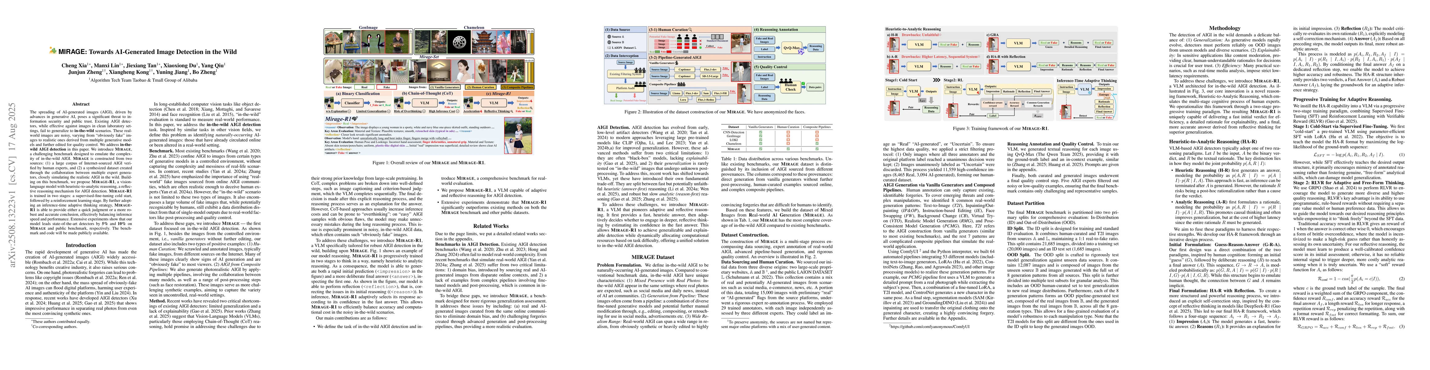 The spreading of AI-generated images (AIGI), driven by advances in generative AI, poses a significant threat to information security and public trust. Existing AIGI detectors, while effective against images in clean laboratory settings, fail to generalize to in-the-wild scenarios. These real-world images are noisy, varying from ``obviously fake" images to realistic ones derived from multiple generative models and further edited for quality control. We address in-the-wild AIGI detection in this paper. We introduce Mirage, a challenging benchmark designed to emulate the complexity of in-the-wild AIGI. Mirage is constructed from two sources: (1) a large corpus of Internet-sourced AIGI verified by human experts, and (2) a synthesized dataset created through the collaboration between multiple expert generators, closely simulating the realistic AIGI in the wild. Building on this benchmark, we propose Mirage-R1, a vision-language model with heuristic-to-analytic reasoning, a reflective reasoning mechanism for AIGI detection. Mirage-R1 is trained in two stages: a supervised-fine-tuning cold start, followed by a reinforcement learning stage. By further adopting an inference-time adaptive thinking strategy, Mirage-R1 is able to provide either a quick judgment or a more robust and accurate conclusion, effectively balancing inference speed and performance. Extensive experiments show that our model leads state-of-the-art detectors by 5% and 10% on Mirage and the public benchmark, respectively. The benchmark and code will be made publicly available.