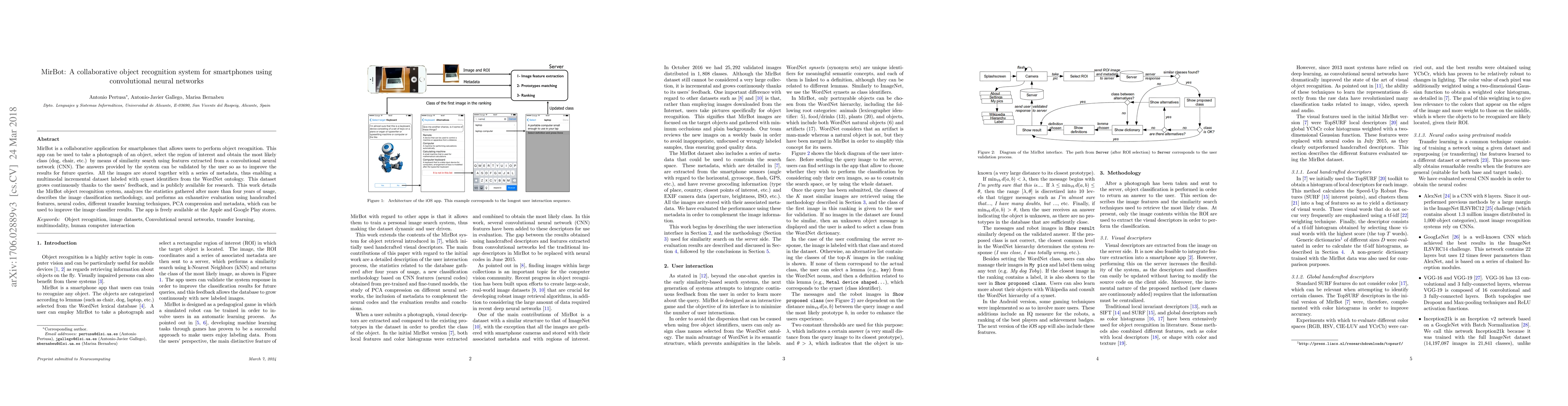 MirBot is a collaborative smartphone app that uses convolutional neural networks (CNN) for object recognition, allowing users to photograph objects and receive class predictions. The system improves over time through user feedback and maintains accuracy despite an expanding dataset.