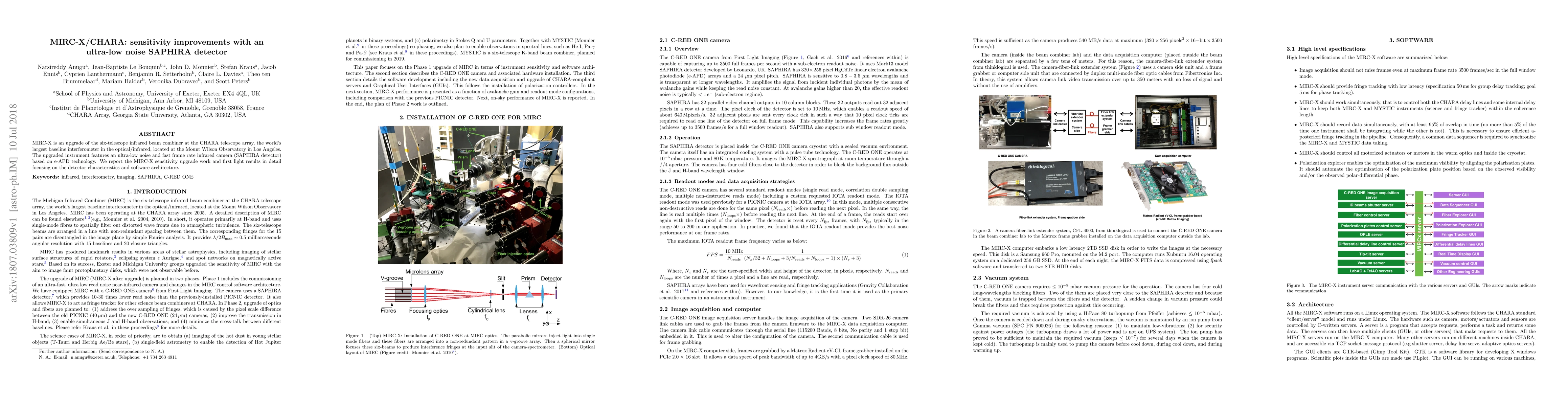 MIRC-X is an upgrade of the six-telescope infrared beam combiner at the CHARA telescope array, the world's largest baseline interferometer in the optical/infrared, located at the Mount Wilson Observatory in Los Angeles. The upgraded instrument features an ultra-low noise and fast frame rate infrared camera (SAPHIRA detector) based on e-APD technology. We report the MIRC-X sensitivity upgrade work and first light results in detail focusing on the detector characteristics and software architecture.