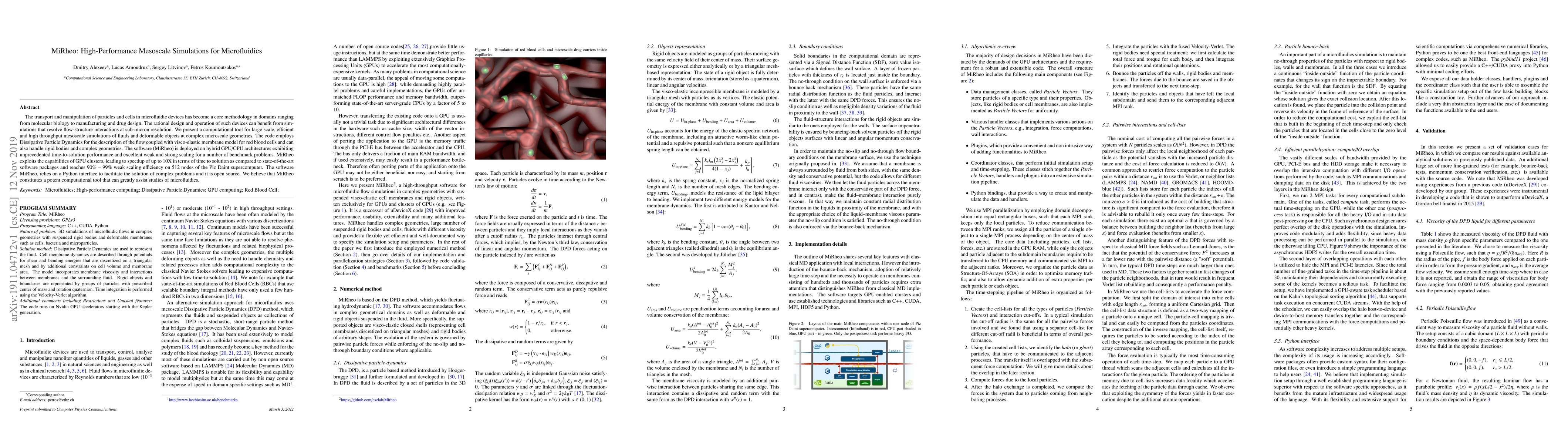 MiRheo is a high-performance computational tool designed for large-scale mesoscale simulations of microfluidics, employing Dissipative Particle Dynamics and visco-elastic membrane models. It achieves significant speedups and scalability on GPU/CPU hybrid architectures, making it a powerful resource for studying microfluidic devices.