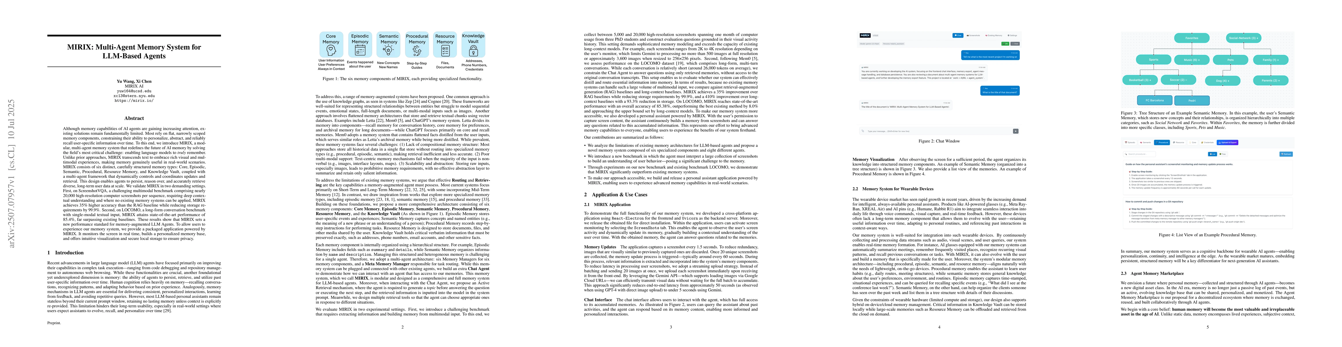 MIRIX's structured and compositional memory architecture, incorporating six specialized memory components managed by dedicated Memory Managers under a Meta Memory Manager, is a significant technical contribution.