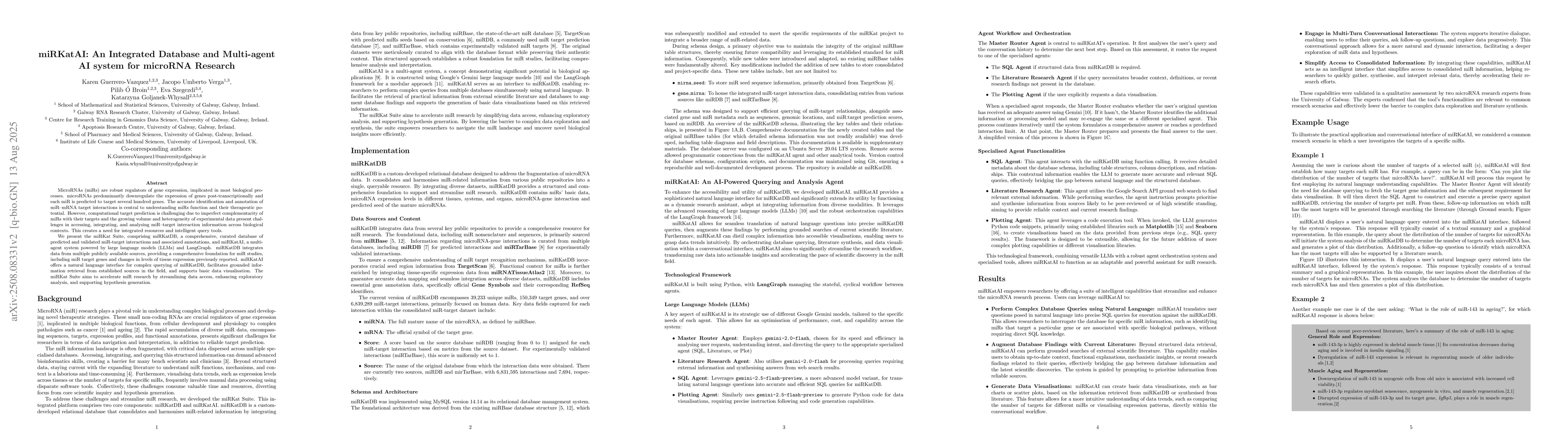 MicroRNAs (miRs) are robust regulators of gene expression, implicated in most biological processes. microRNAs predominantly downregulate the expression of genes post-transcriptionally and each miR is predicted to target several hundred genes. The accurate identification and annotation of miR-mRNA target interactions is central to understanding miRs function and their therapeutic potential. However, computational target prediction is challenging due to imperfect complementarity of miRs with their targets and the growing volume and heterogeneity of experimental data present challenges in accessing, integrating, and analysing miR-target interaction information across biological contexts. This creates a need for integrated resources and intelligent query tools. We present the miRKat Suite, comprising miRKatDB, a comprehensive, curated database of predicted and validated miR-target interactions and associated annotations, and miRKatAI, a multi-agent system powered by large language models (LLMs) and LangGraph. miRKatDB integrates data from multiple publicly available sources, providing a comprehensive foundation for miR studies, including miR target genes and changes in levels of tissue expression previously reported. miRKatAI offers a natural language interface for complex querying of miRKatDB, facilitates grounded information retrieval from established sources in the field, and supports basic data visualisation. The miRKat Suite aims to accelerate miR research by streamlining data access, enhancing exploratory analysis, and supporting hypothesis generation.