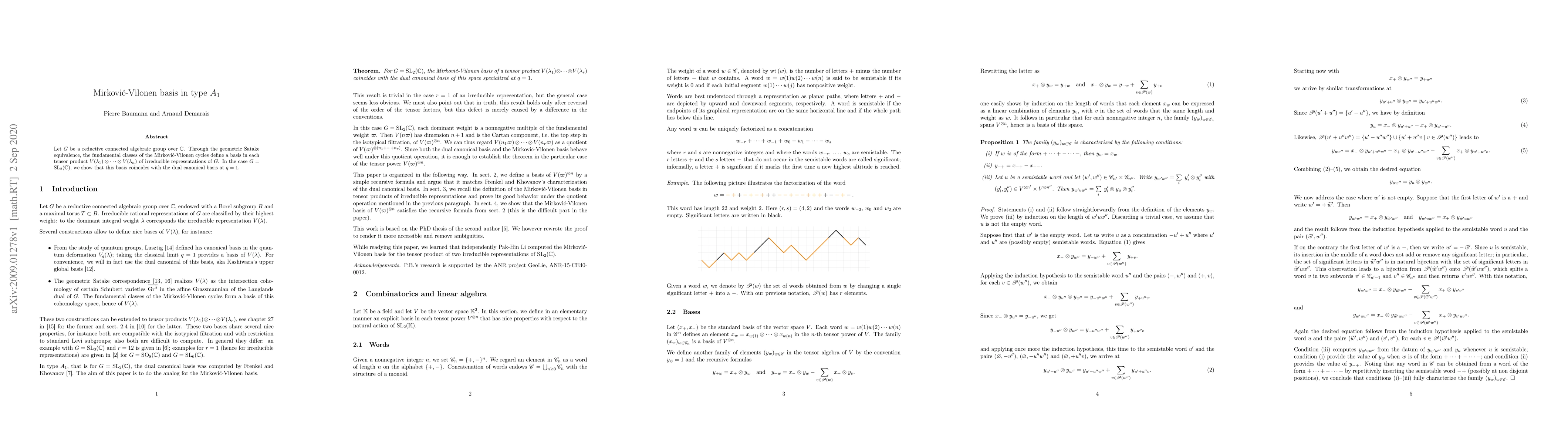 This paper demonstrates the equivalence between the Mirkovi\'c-Vilonen basis in the tensor products of rational irreducible representations of the group G=SL_2(C) and the dual canonical basis at q=1, via the geometric Satake equivalence.