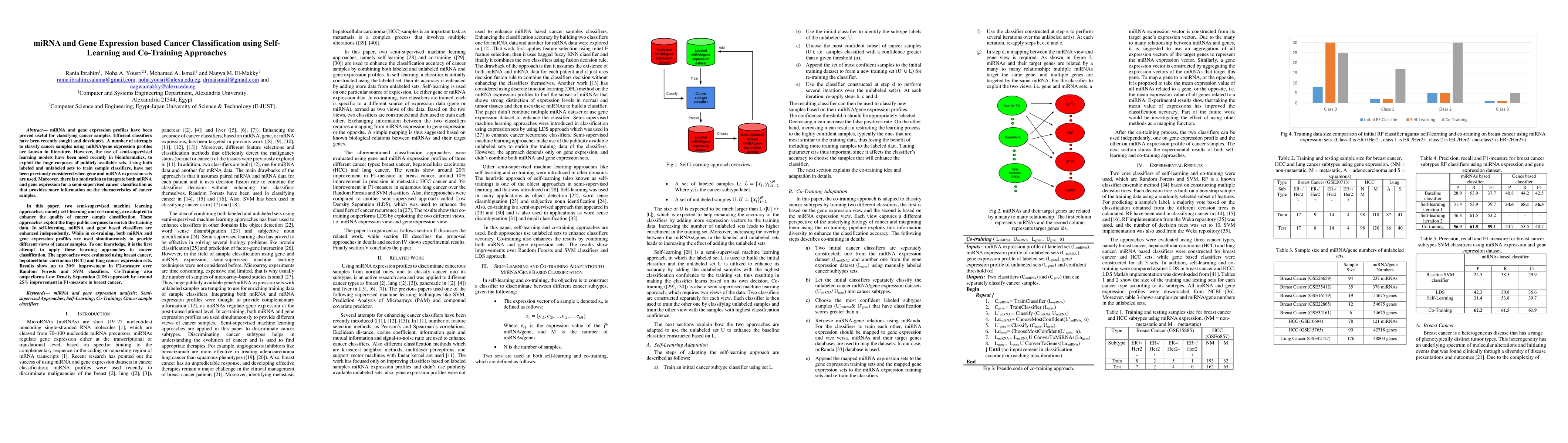 This paper explores the use of self-learning and co-training semi-supervised machine learning approaches to classify cancer samples based on miRNA and gene expression profiles. The results show significant improvements in classification accuracy, particularly with co-training, which outperforms existing methods by up to 25% in some cases.