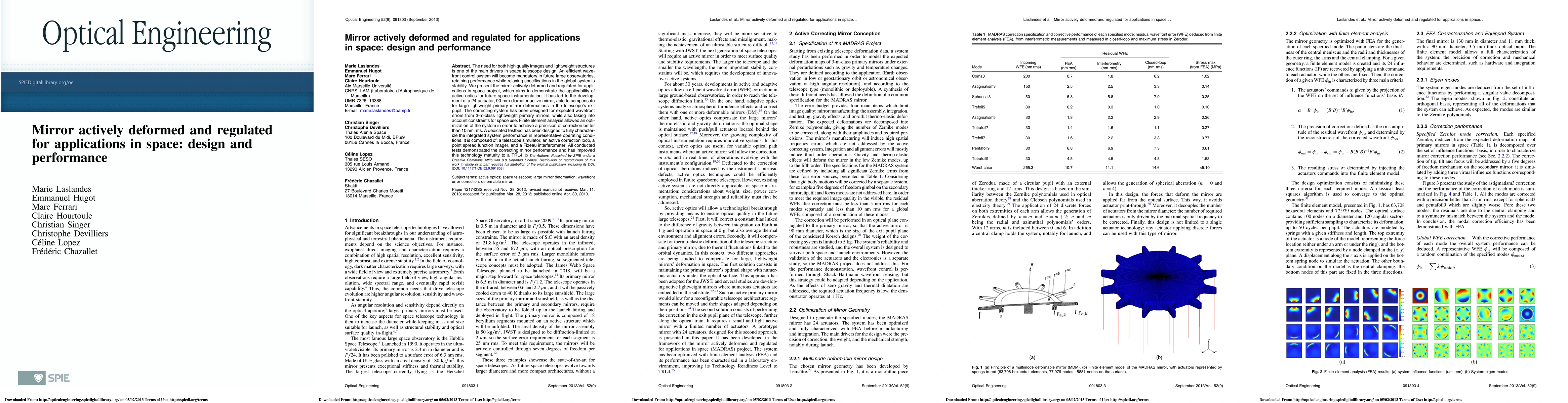 The need for both high quality images and lightweight structures is one of the main drivers in space telescope design. An efficient wavefront control system will become mandatory in future large observatories, retaining performance while relaxing specifications in the global system's stability. We present the mirror actively deformed and regulated for applications in space project, which aims to demonstrate the applicability of active optics for future space instrumentation. It has led to the development of a 24-actuator, 90-mm-diameter active mirror, able to compensate for large lightweight primary mirror deformations in the telescope's exit pupil. The correcting system has been designed for expected wavefront errors from 3-m-class lightweight primary mirrors, while also taking into account constraints for space use. Finite element analysis allowed an optimization of the system in order to achieve a precision of correction better than 10 nm rms. A dedicated testbed has been designed to fully characterize the integrated system performance in representative operating conditions. It is composed of: a telescope simulator, an active correction loop, a point spread function imager, and a Fizeau interferometer. All conducted tests demonstrated the correcting mirror performance and has improved this technology maturity to a TRL4.